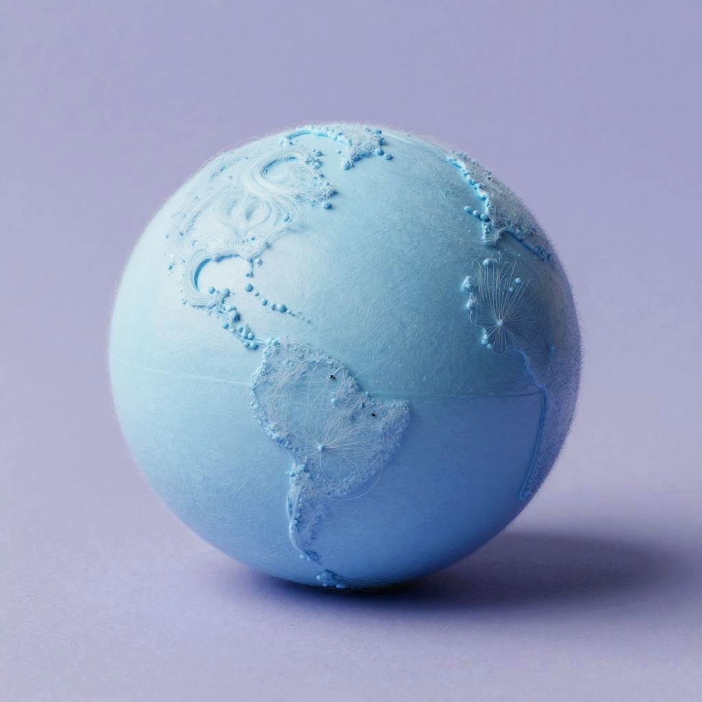In a digital pastel art composition symbolizing inspiration and innovation, a soft baby blue orb features a filament of fine flowing spline set against a muted lavender backdrop. – Upscaled (Light) by,