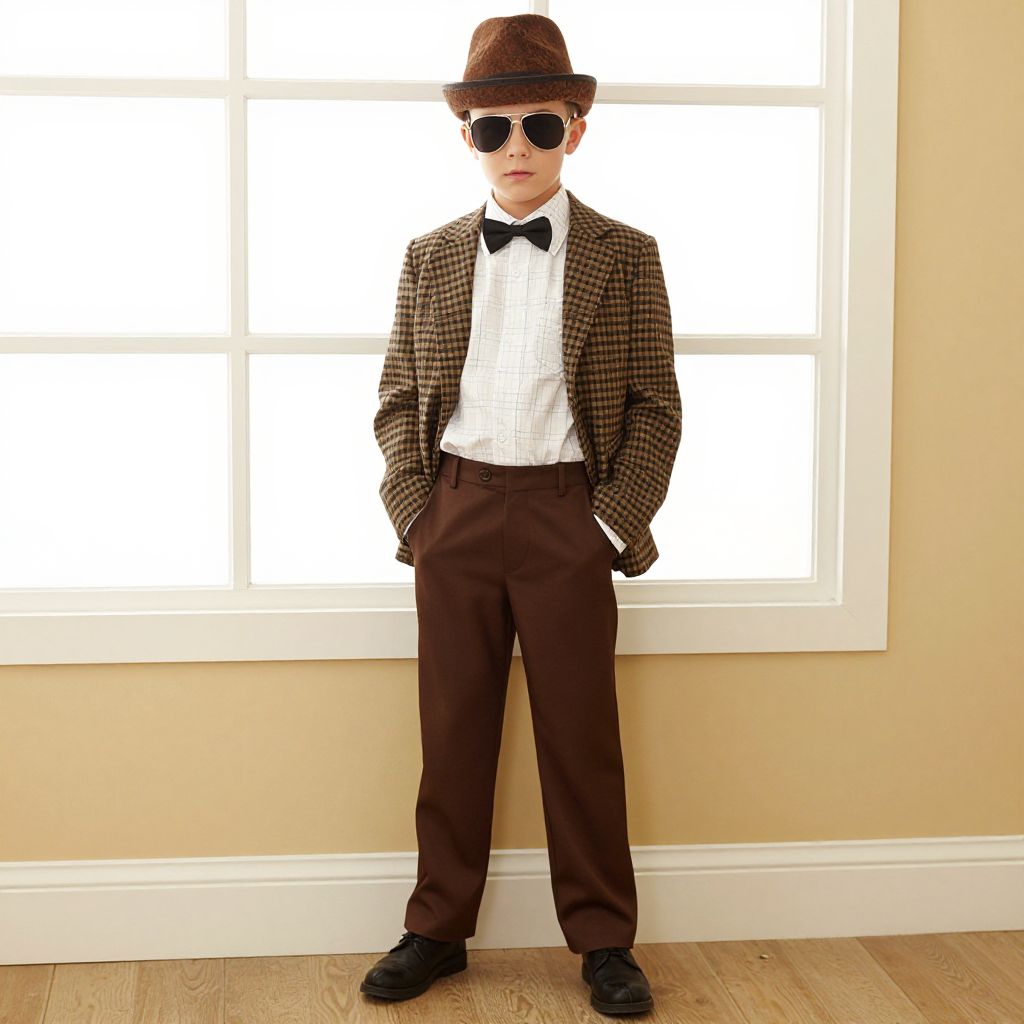Photograph of a young boy in a brown houndstooth suit, black bow tie, white shirt, dark sunglasses, brown fedora, standing