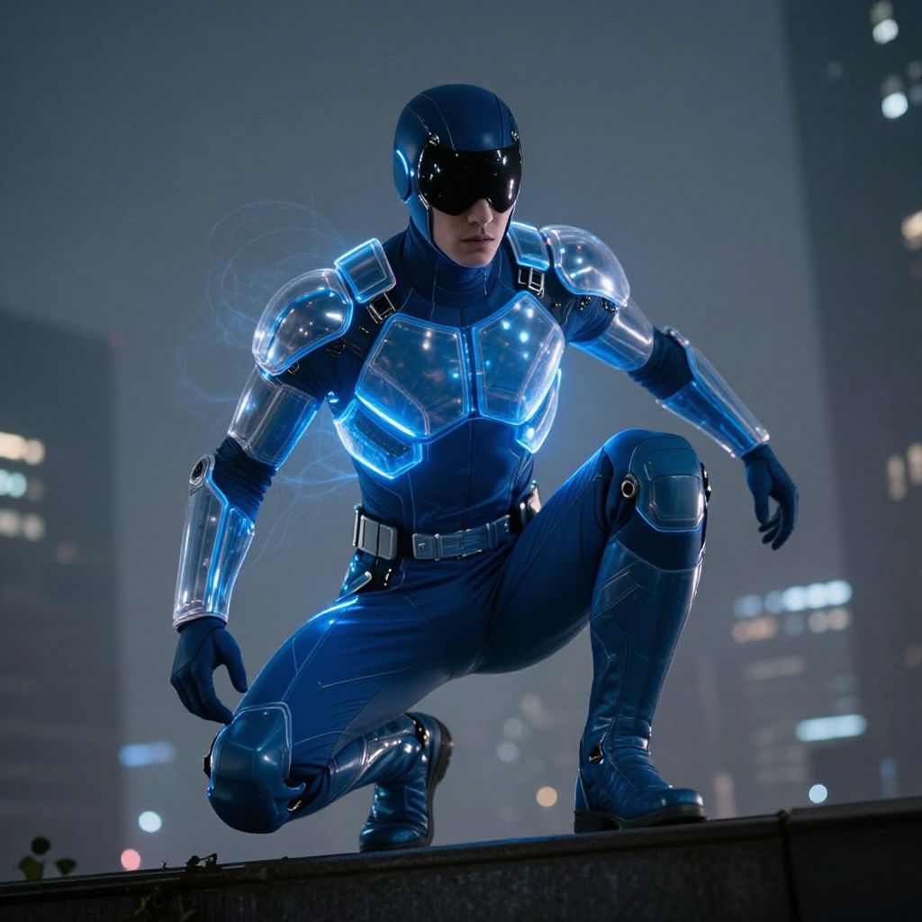 A dramatic nighttime scene of a blue costumed superhero in a high-tech stealth design, with transparent blue panels and glowing seams, crouched behind a skyscraper in a city with fog, the hero’s face is partially shadowed but clearly shows determination and strength, the outfit reflects ambient light and has a faint aura of blue energy spreading from it.