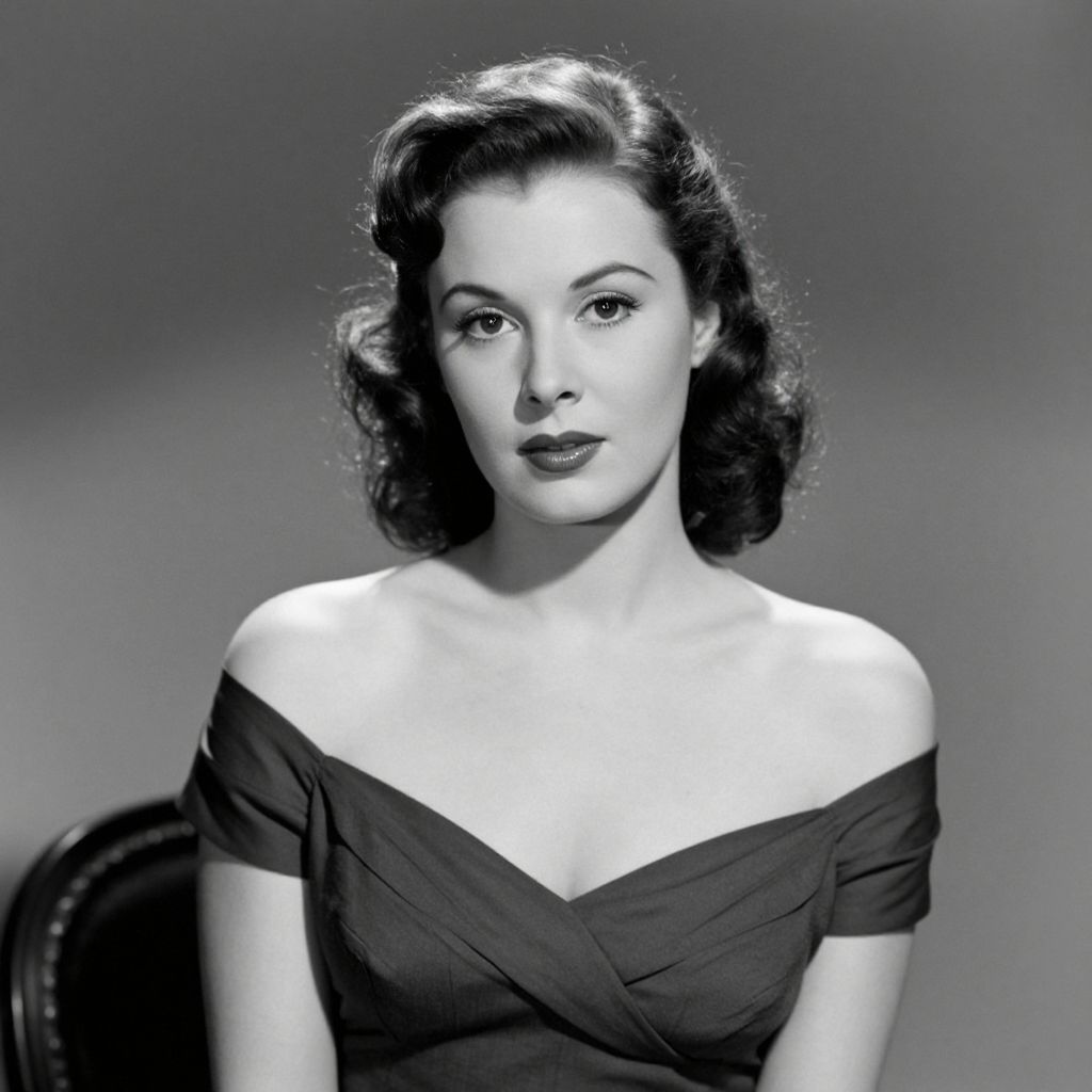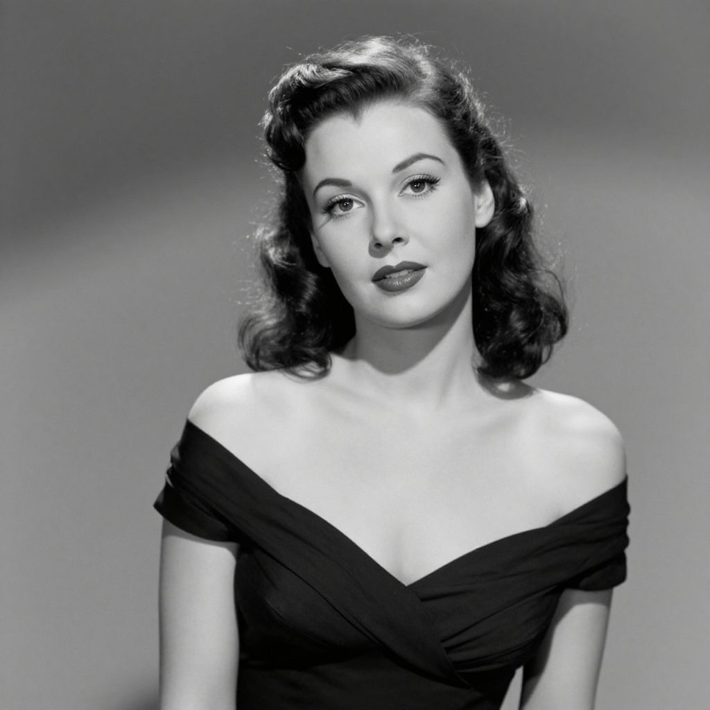 A classic black-and-white promotional portrait featuring a poised and elegant woman in a vintage off-the-shoulder dress, captured with dramatic lighting and a timeless cinematic aesthetic reminiscent of the 1940s era, as seen in the Oscar-winning film *Mildred Pierce*.