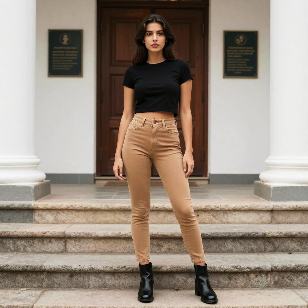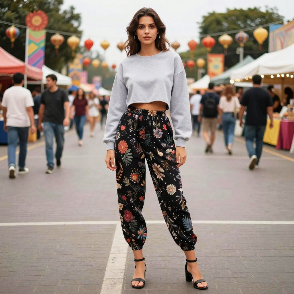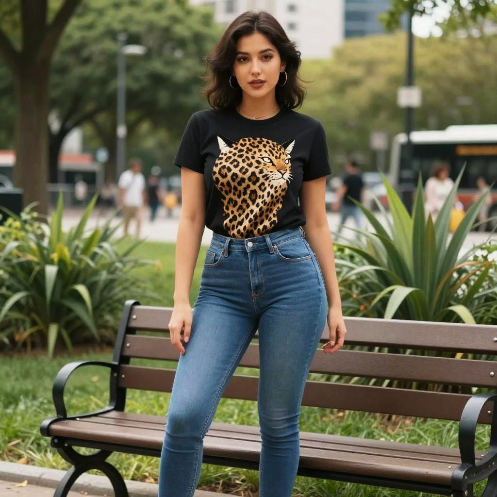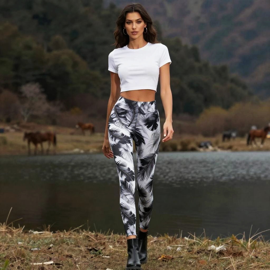 A slim woman in an eclectic style, wearing a black crop top and high-waisted leggings with vibrant forest and tiger prints, stands under a gazebo in a riverside park, complemented by black lace-up ankle boots. The scene is infused with a whimsical visual style, capturing the essence of nature and urban flair. Sexy. Pretty face and beutiful eyes