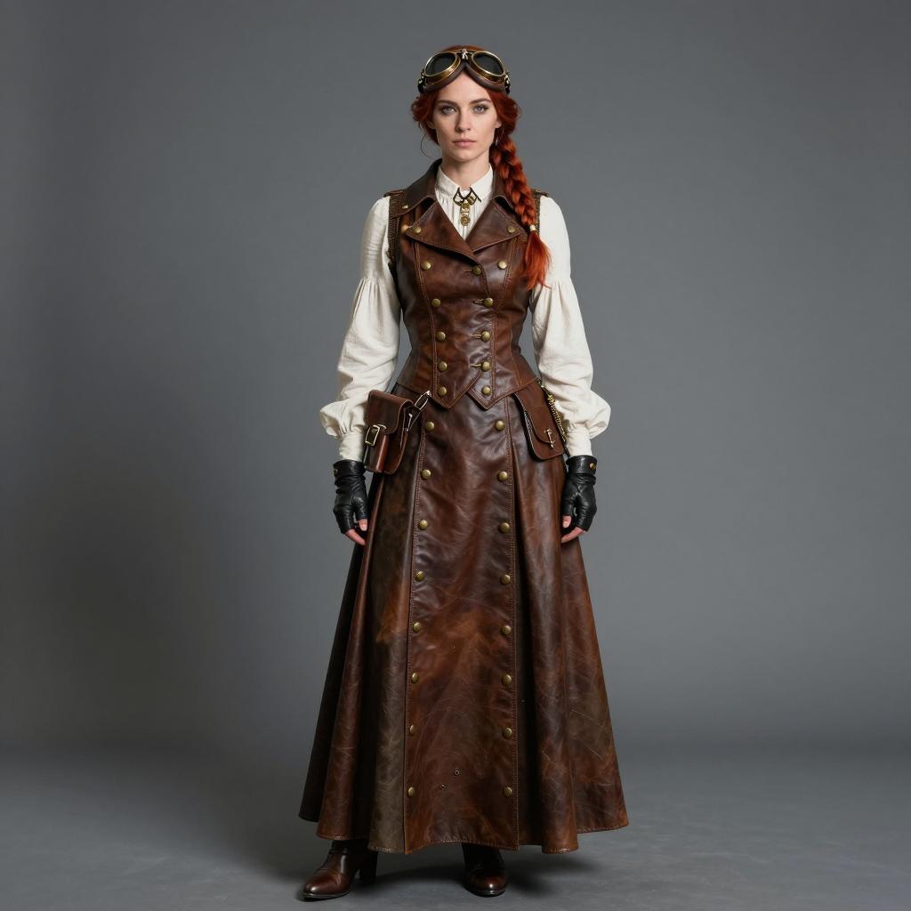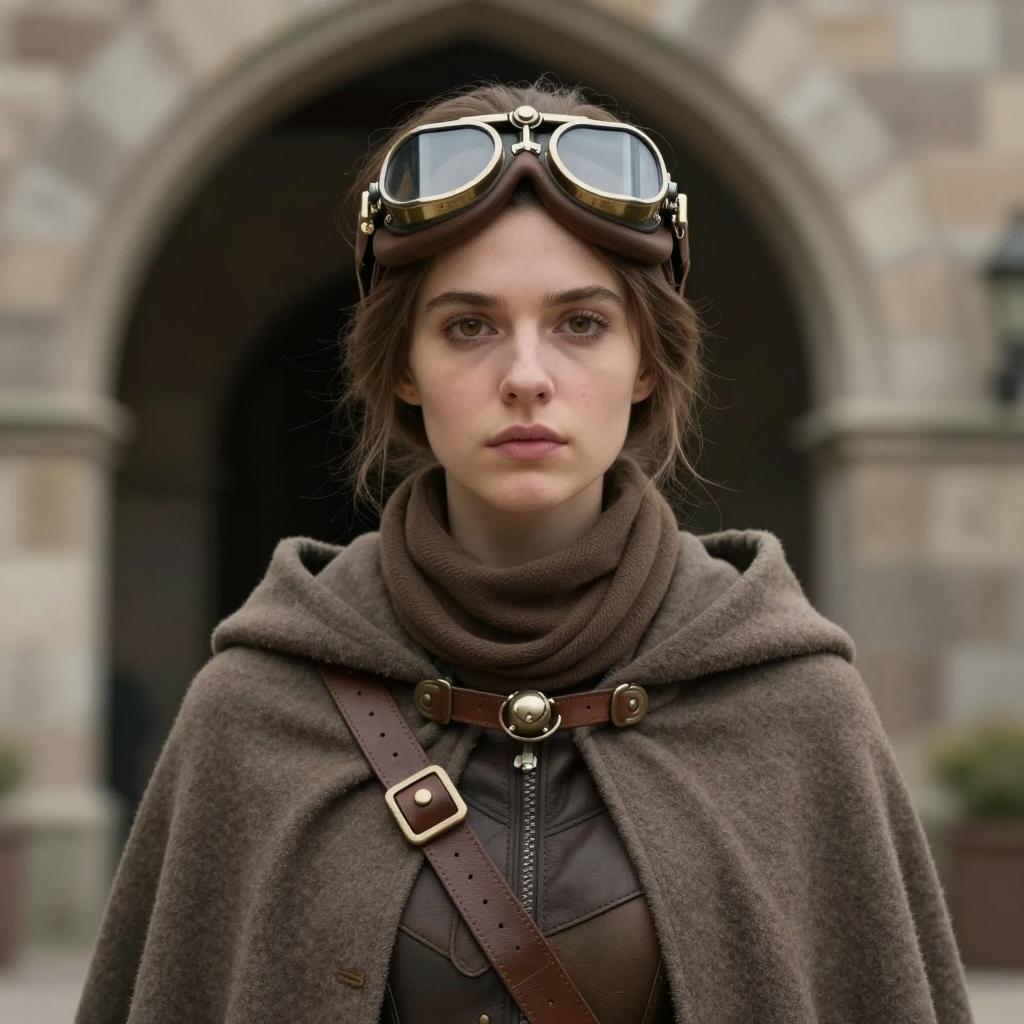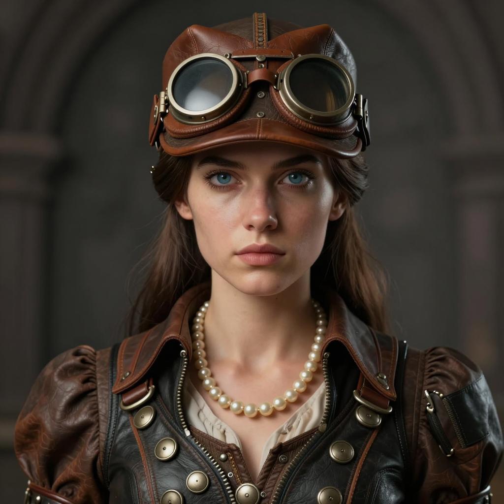 Steampunk outfit, photorealistic, close-up, young woman, steampunk outfit, brown leather goggles on hat, blue eyes, serious expression, brown shirt with puffy sleeves, black leather vest, large silver buttons, pearl necklace, brown hair tied back, soft lighting, blurred background, dark colors, detailed ures, realistic skin, CGI, digital art, detailed facial features, vintage style, front view, focused gaze