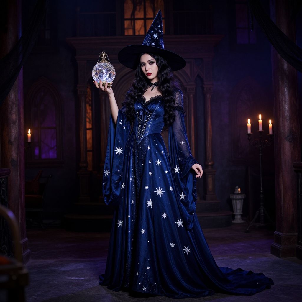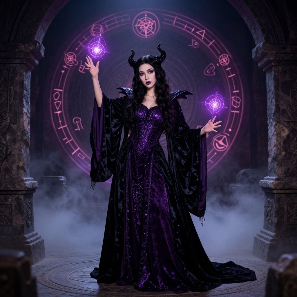 Ula Halloween costume inspired by a dark enchanting sorceress, draped in velvet black and deep purple with intricate mystical symbols, casting spells in an ancient stone circle with glowing runes and fog, cinematic and mysterious mood.
