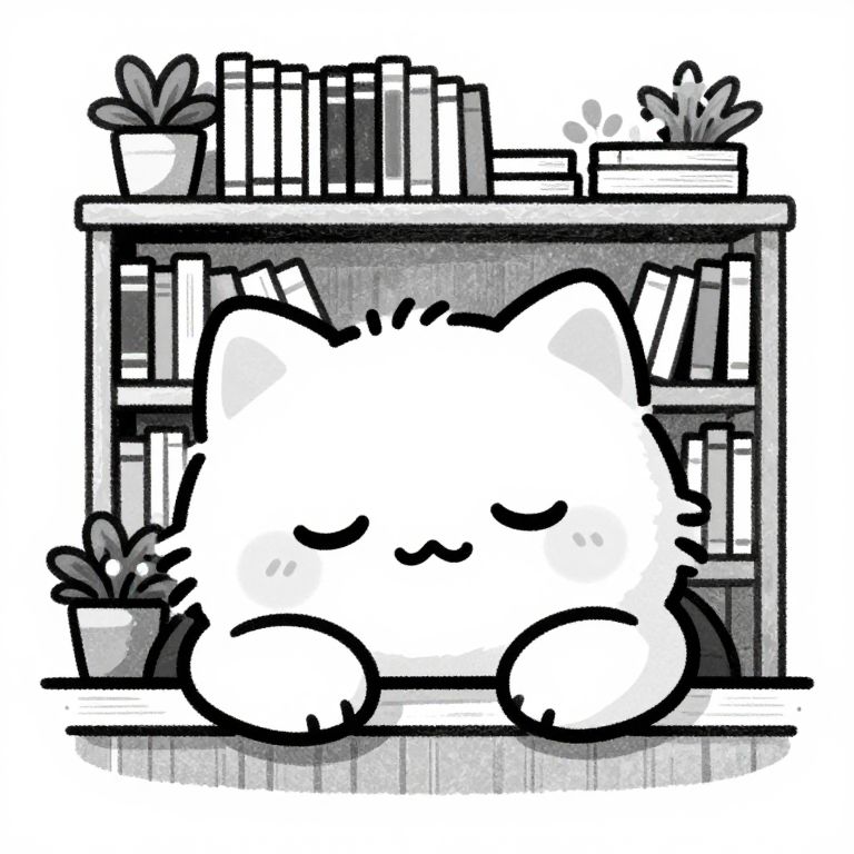 This is a black-and-white digital drawing in a cute, cartoon style. It features a large, fluffy, white cat with closed eyes and a content smile, sitting in front of a bookshelf. The cat's outline is bold and simple, with minimal shading. The bookshelf behind the cat is filled with books of various sizes and some potted plants. The top shelf has two potted plants and a stack of tall books. The middle shelf has more books, while the bottom shelf has a single potted plant. The overall texture is smooth with a slight grainy effect, adding depth to the image.