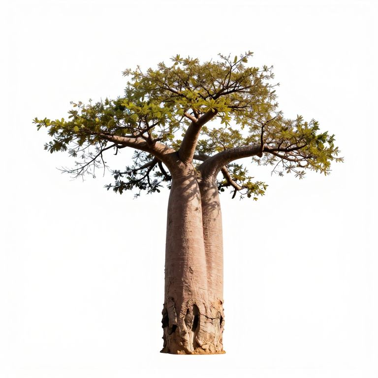 Photograph of a tall, slender tree with a thick, textured trunk and a broad, canopy of sparse, green leaves. The trunk is rough and brown, with visible grooves and a slightly gnarled base. The branches spread out horizontally, supporting small clusters of leaves. The background is completely white, isolating the tree and emphasizing its shape and texture. The image is brightly lit, highlighting the tree's natural details and shadows.