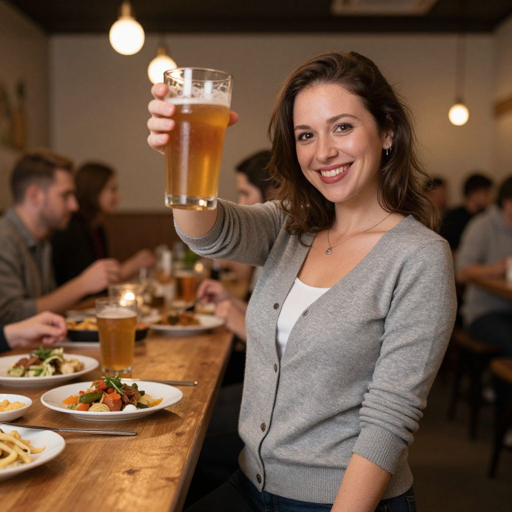 Woman in gray cardigan stands near a wooden table, cheerfully raising a glass of amber beer while smiling warmly at the camera, surrounded by softly lit ambiance and blurred figures enjoying their meals in the background.