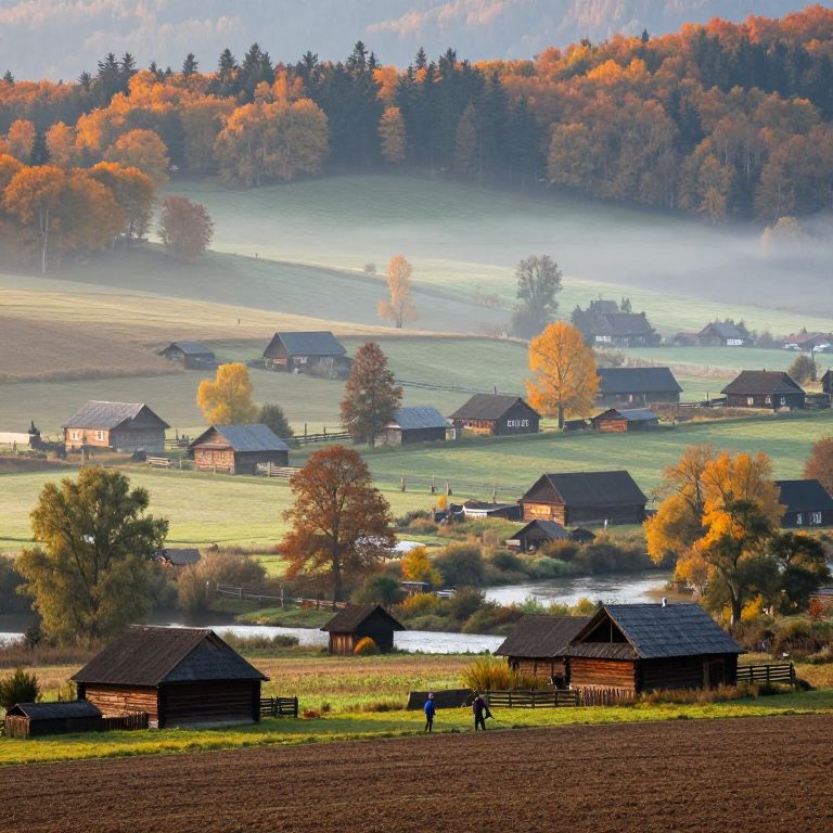 Czechoslovakia countryside in early autumn, rolling hills dotted with traditional wooden cottages and vibrant forests, mist rising over serene rivers, farmers tending to fields, evocative of peaceful rural life, natural color palette, soft morning light