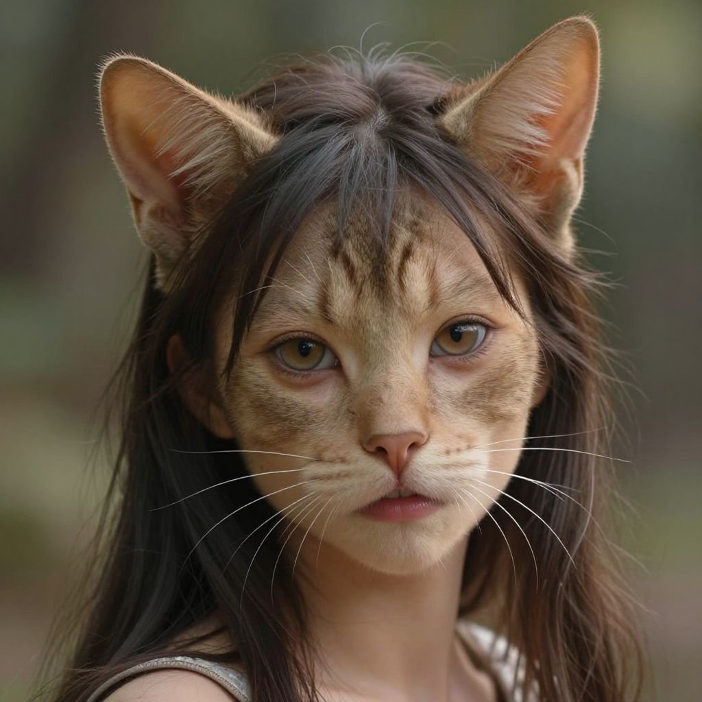 Photorealistic digital artwork of a young woman with cat-like features. She has a feline face with large, pointed ears, brown and beige striped fur, and expressive amber eyes. Her dark brown, straight hair falls around her face. She has a pink nose and prominent white whiskers. She wears a sleeveless, gray top. The background is softly blurred with green and brown hues, suggesting an outdoor forest setting. The blend of human and cat elements creates a surreal, anthropomorphic effect. The image focuses closely on her face, highlighting the texture of her fur and the realistic detailing of her feline features.