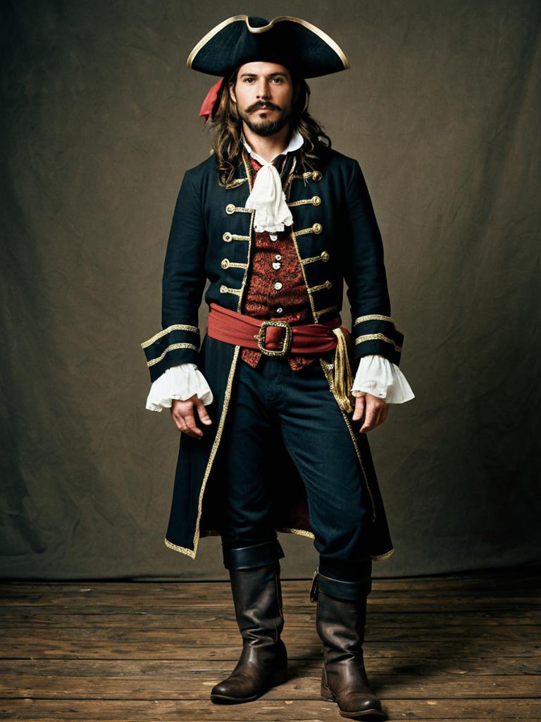 Adult sebastian costume, 1boy, solo, facial hair, male focus, beard, hat, boots, standing, belt, mustache, full body, long sleeves, pants, ascot, brown hair, pirate, looking at viewer
