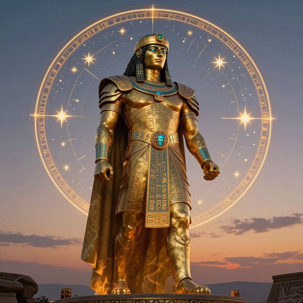 Anunnaki warrior depicted with towering stature, celestial armor adorned with cuneiform symbols, surrounded by ancient star maps, epic and mythic scene at twilight