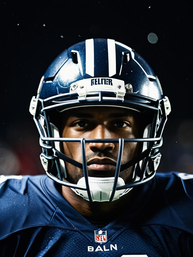 Football player in stylish gear, close-up dramatic headshot with helmet
