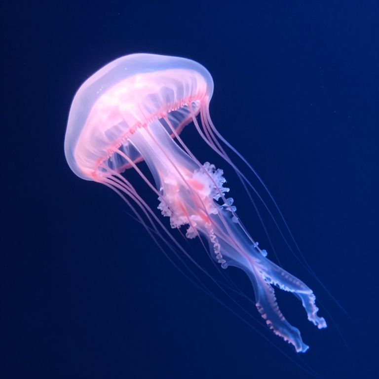 Glowing translucent jellyfish gracefully drifts through deep blue ocean waters, its ethereal pinkish-white bell and intricate tentacles shimmering with bioluminescent light, creating a mesmerizing contrast against the dark, serene backdrop.