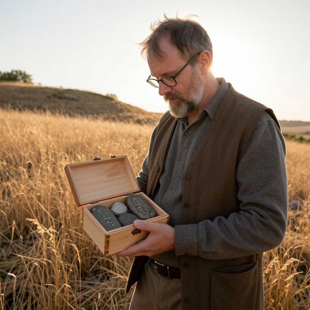 An archaeologist in a field of dry, golden grass holding a small wooden box open on a hillside in Northern Europe, revealing several ancient rune stones with faded letters; the man has a focused, thoughtful face with a gray beard and glasses, standing during golden hour with the sun behind him.