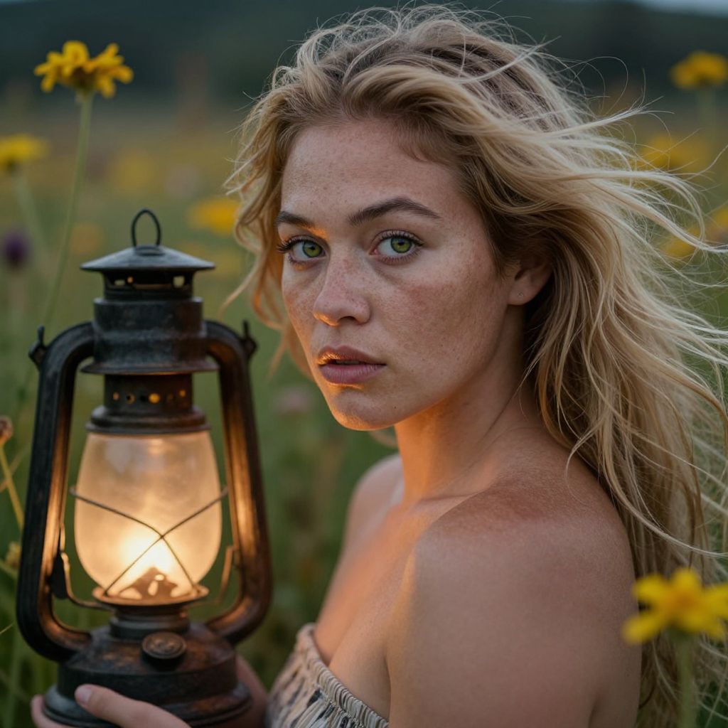 Photograph of a fair-skinned, blonde woman with green eyes and freckles, holding a black, antique lantern with a glowing light. She has wavy hair blowing in the wind, wearing a strapless, patterned top. The background is a blurred field with yellow wildflowers and green grass, suggesting a nighttime outdoor setting. The lantern's light casts a warm glow on her face, highlighting her intense, slightly concerned expression. The image has a soft focus, enhancing the dreamy, ethereal atmosphere.