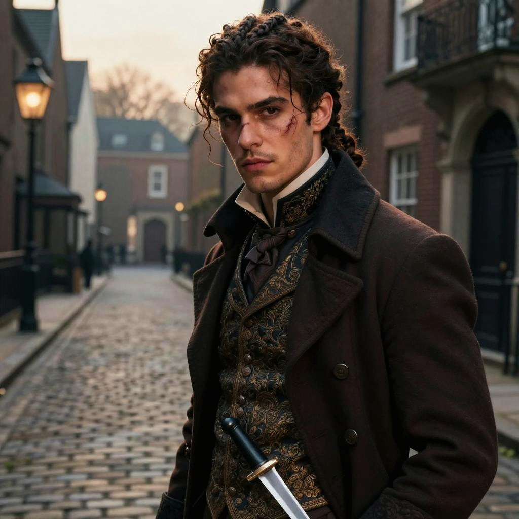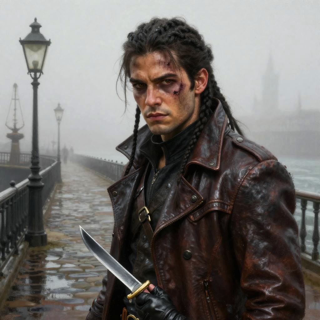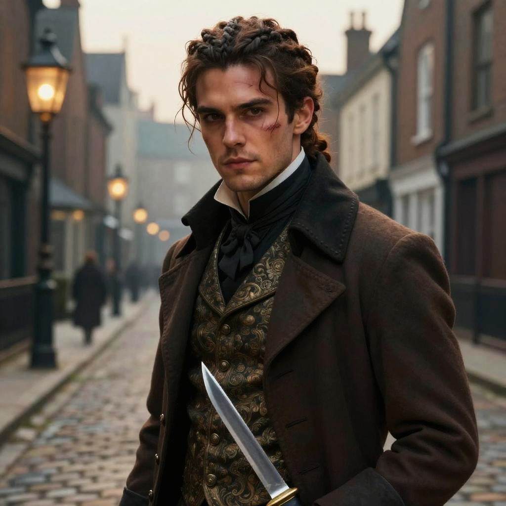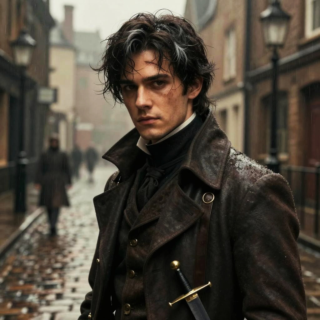 28 year old assassin, dark messy hair with subtle silver streaks, slightly tousled, Appearance handsome — beautiful yet rugged, tan skin, soft expression, narrow brown eyes, faint diagonal scar across right eyebrow, high-collared Victorian coat with concealed straps and a hint of a hidden blade, detailed, atmospheric color washes with warm sepia highlights, soft rain-lit reflections, Victorian rainy cobblestone street, high quality