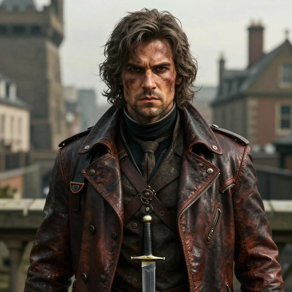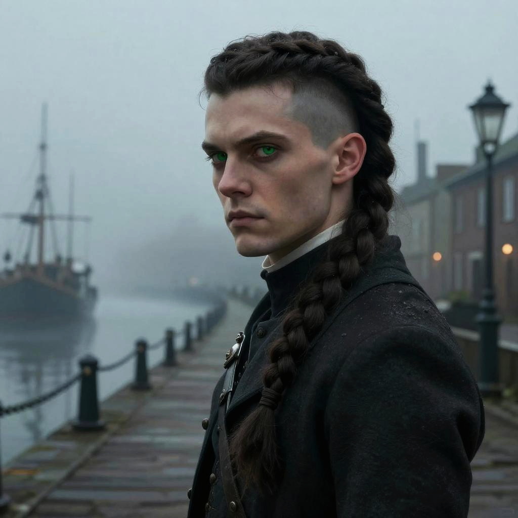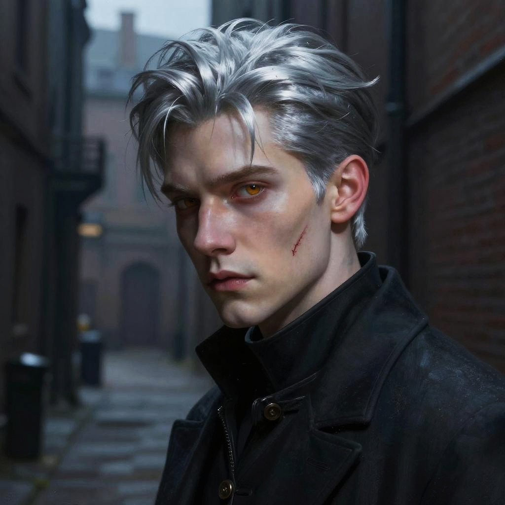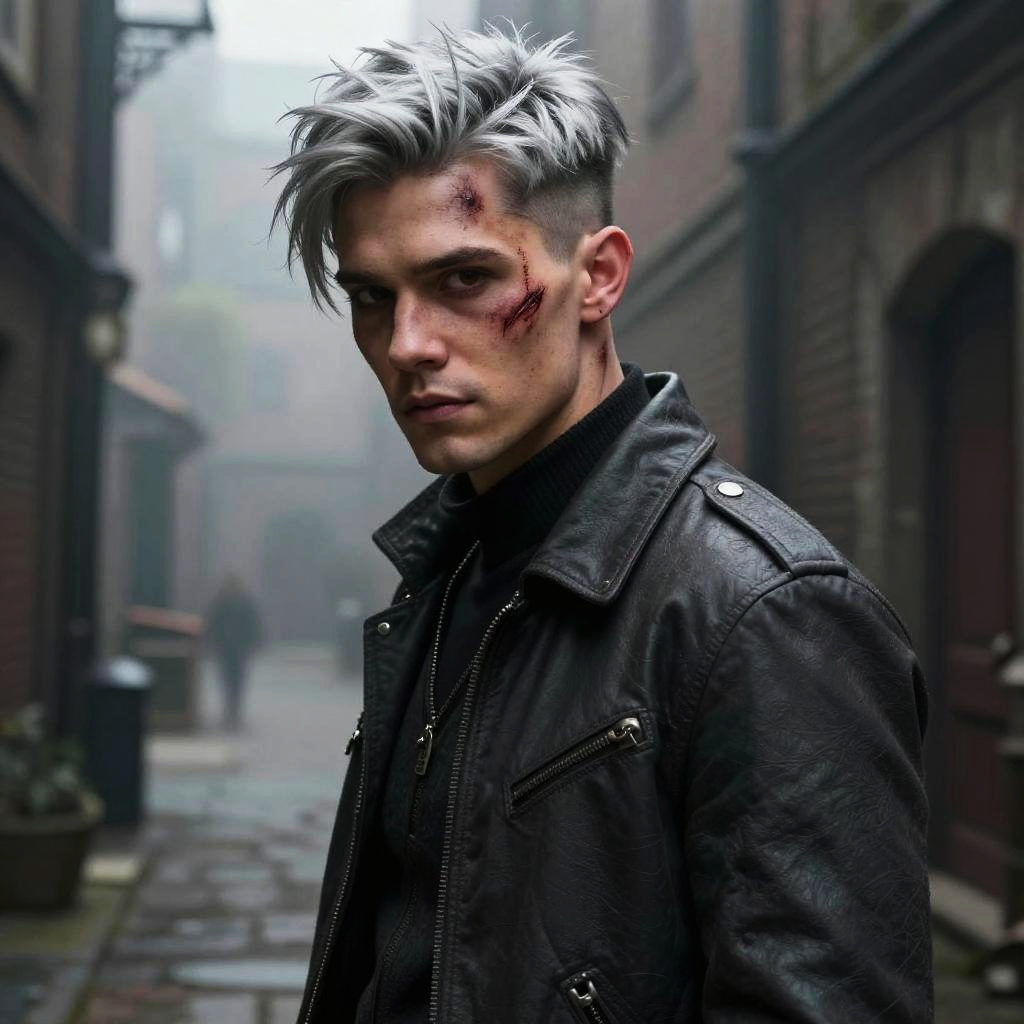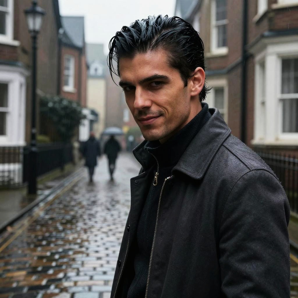 28 year old assassin, dark messy hair with subtle silver streaks, slightly tousled, Appearance handsome — beautiful yet rugged, tan skin, soft expression, narrow brown eyes, faint diagonal scar across right eyebrow, high-collared Victorian coat with concealed straps and a hint of a hidden blade, detailed, atmospheric color washes with warm sepia highlights, soft rain-lit reflections, Victorian rainy cobblestone street, high quality