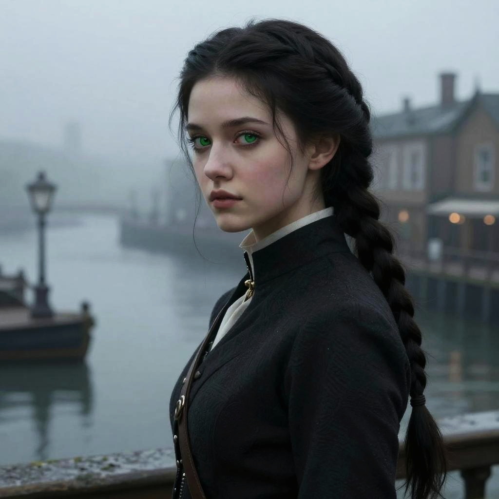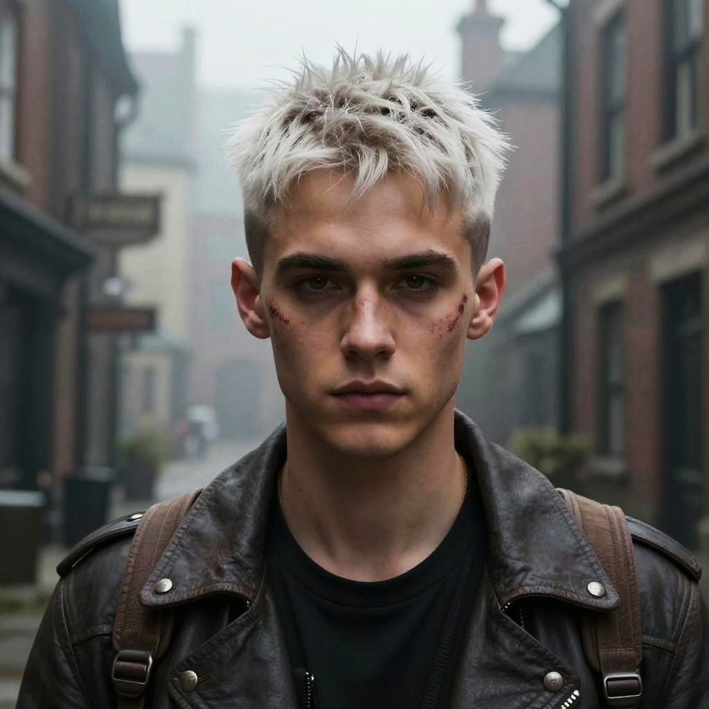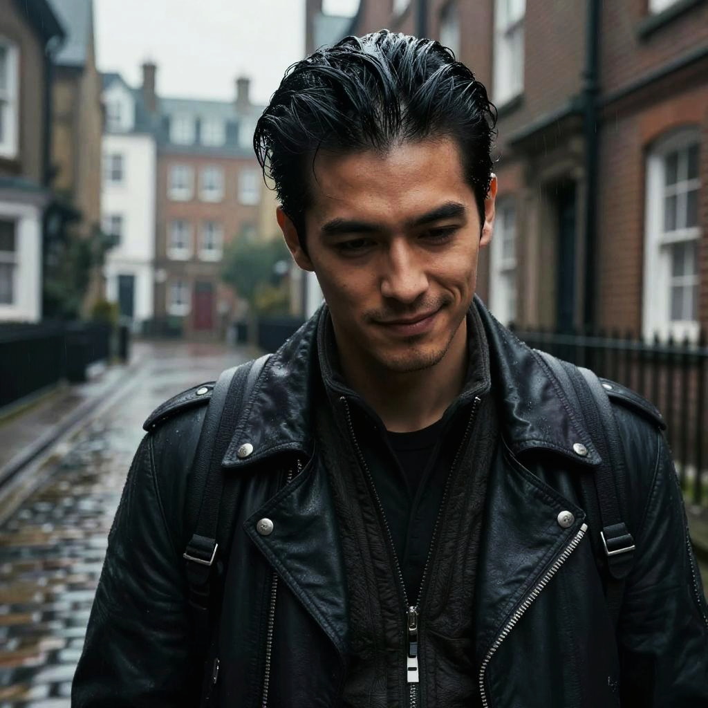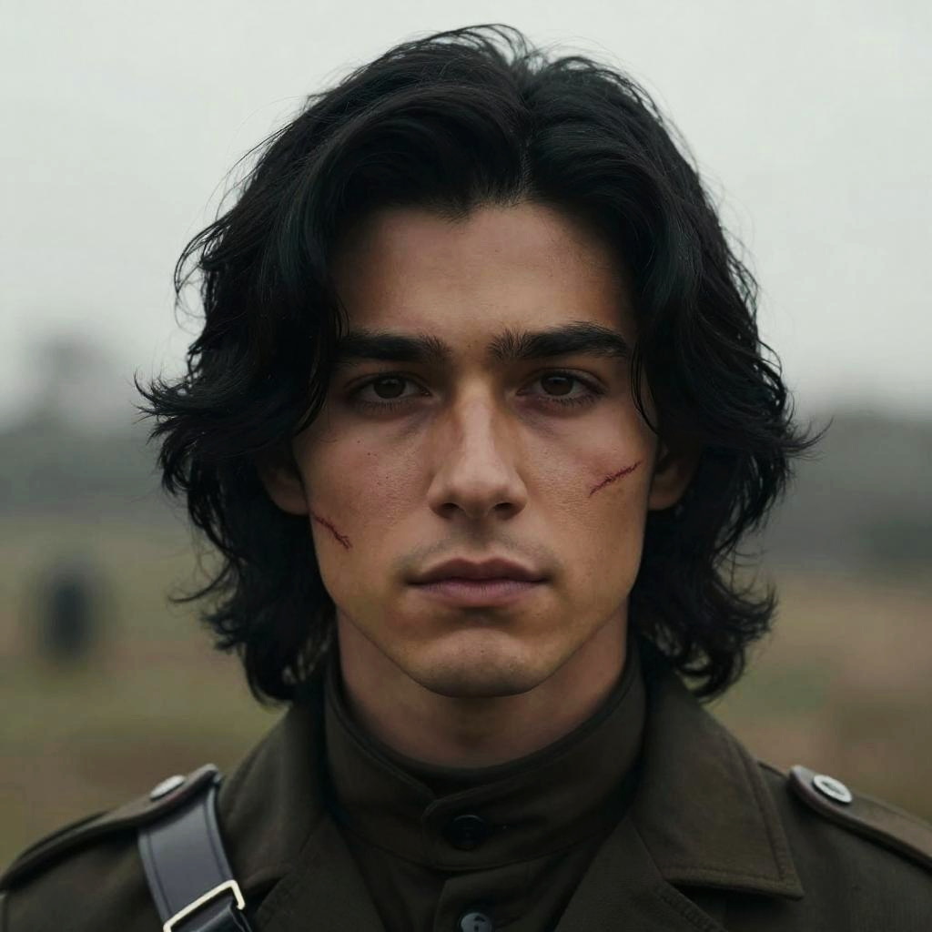 28 year old assassin, dark messy hair with subtle silver streaks, slightly tousled, Appearance handsome — beautiful yet rugged, tan skin, soft expression, narrow brown eyes, faint diagonal scar across right eyebrow, high-collared Victorian coat with concealed straps and a hint of a hidden blade, detailed, atmospheric color washes with warm sepia highlights, soft rain-lit reflections, Victorian rainy cobblestone street, high quality