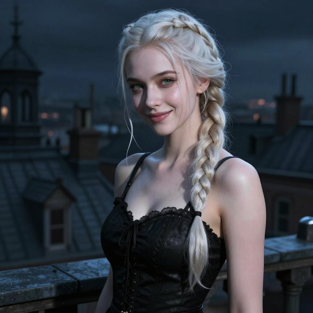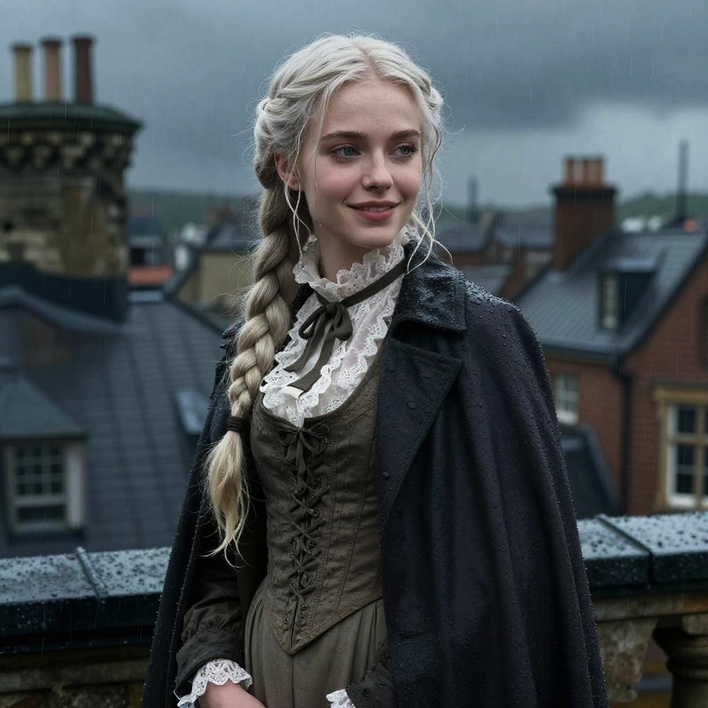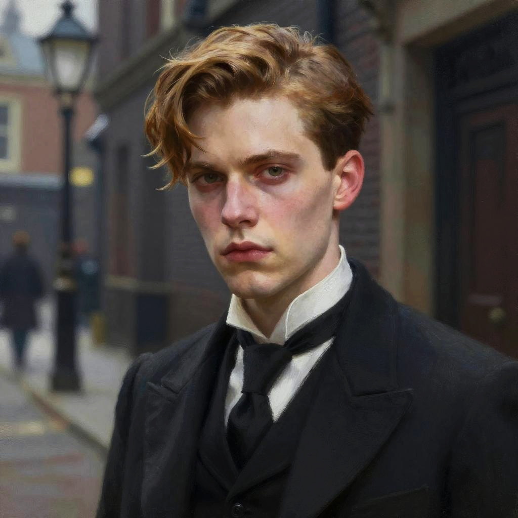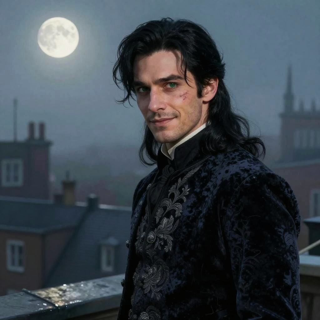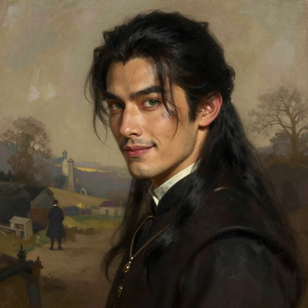 28 year old assassin, dark messy hair with subtle silver streaks, slightly tousled, Appearance handsome — beautiful yet rugged, tan skin, soft expression, narrow brown eyes, faint diagonal scar across right eyebrow, high-collared Victorian coat with concealed straps and a hint of a hidden blade, detailed, atmospheric color washes with warm sepia highlights, soft rain-lit reflections, Victorian rainy cobblestone street, high quality
