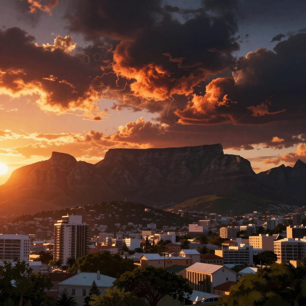 Beautiful anime landscape of Cape Town at sunset, featuring a table mountain silhouette, very intricate, very detailed, sharp, fiery and dramatic