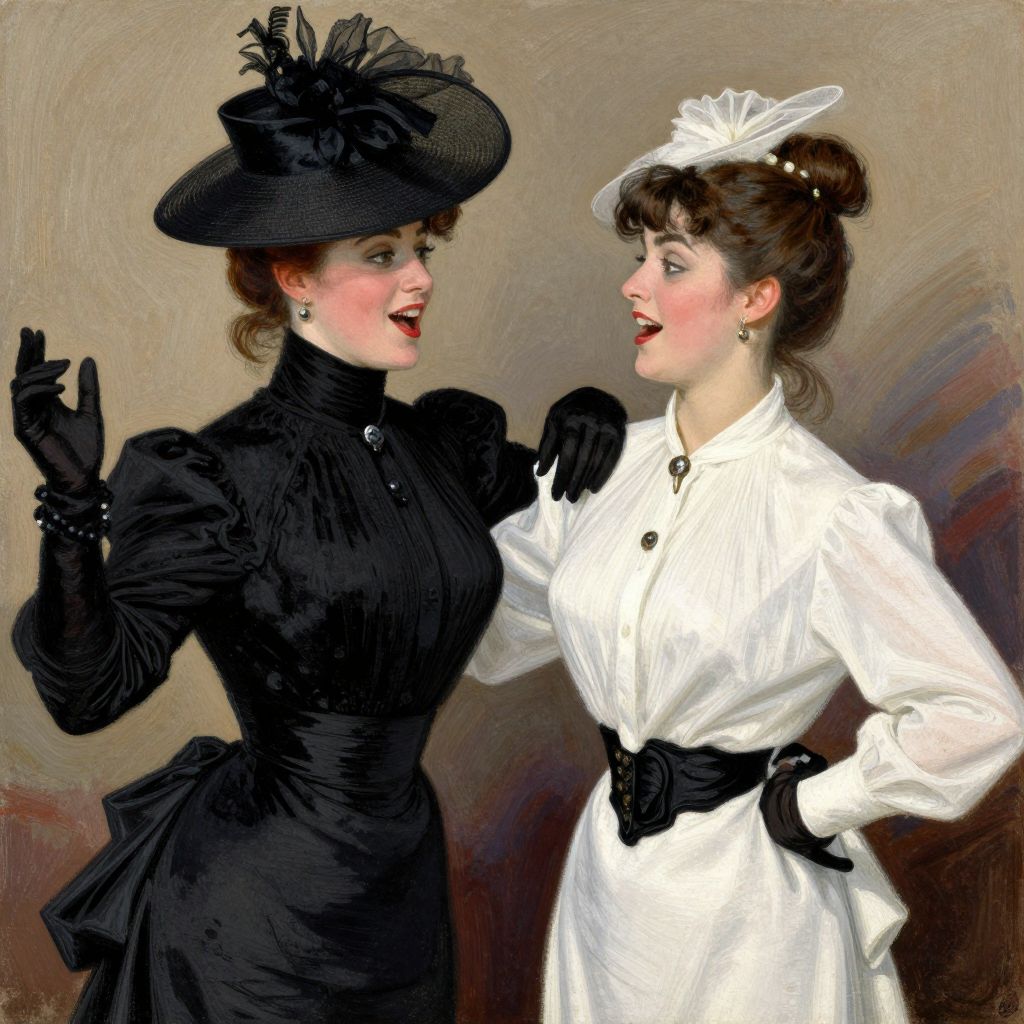 In this captivating illustration, two elegantly dressed women engage in a lively conversation, their faces turned towards each other in a moment of shared amusement. The woman on the left, adorned in a striking black dress with a wide-brimmed hat, exudes a sense of sophistication and mystery. Her counterpart, dressed in a pristine white blouse with a black belt, adds a touch of contrast and balance to the scene. The women's attire, characterized by intricate details and a high level of craftsmanship, reflects the fashion of the late 19th century. The background is a muted, earthy tone, allowing the subjects to stand out prominently. The overall composition, with the women positioned close together and their gazes locked, creates a dynamic and engaging visual narrative. The style of the artwork, reminiscent of Auguste Charles Mengin and Henri de Toulouse-Lautrec, is evident in the bold lines and expressive brushstrokes that bring the scene to life.