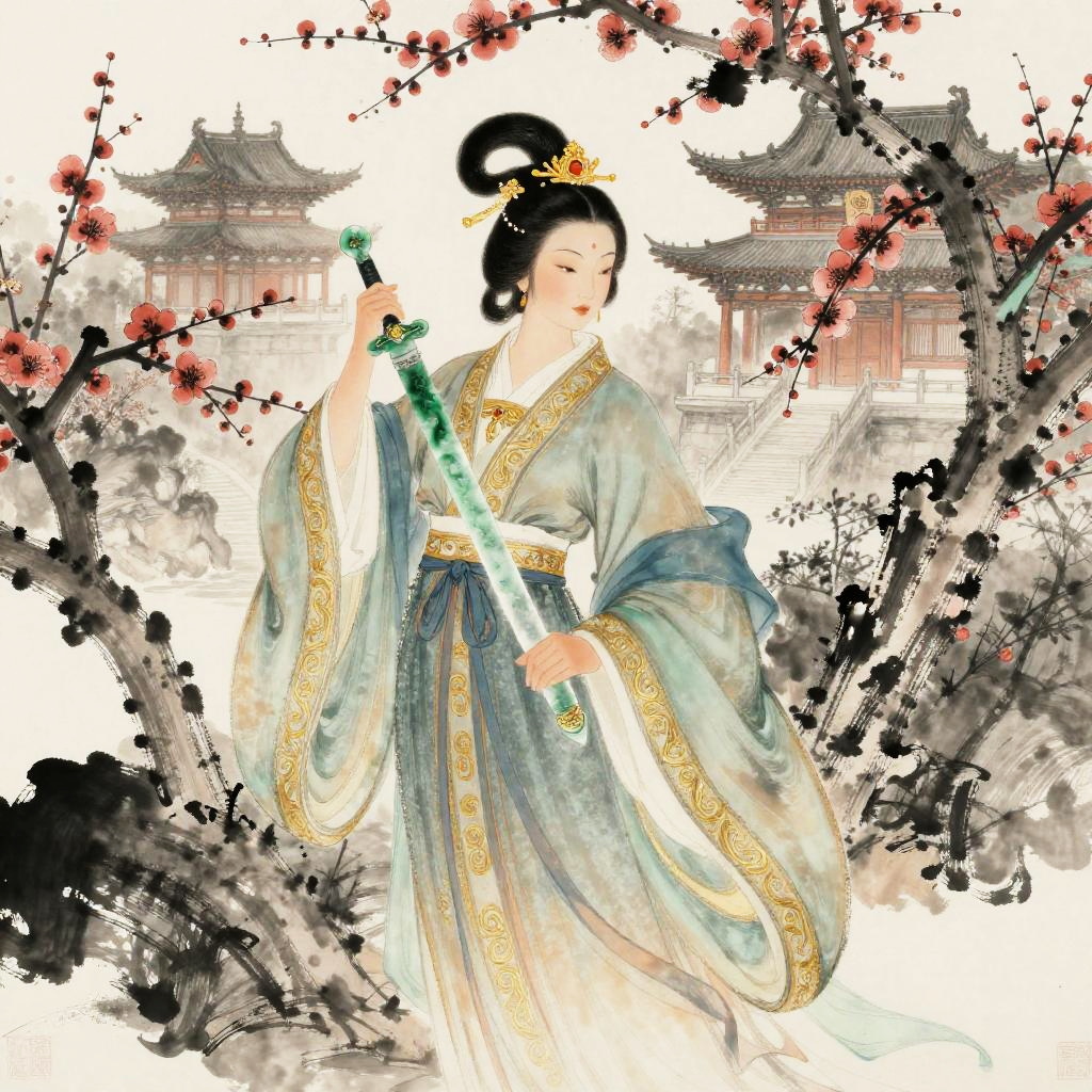 A serene yet powerful Northern Wei dynasty Mulan shown holding a jade sword, dressed in flowing silk robes with golden embroidery, surrounded by blossoming plum trees and ancient stone temples, evoking a mystic atmosphere inspired by traditional Chinese ink painting.