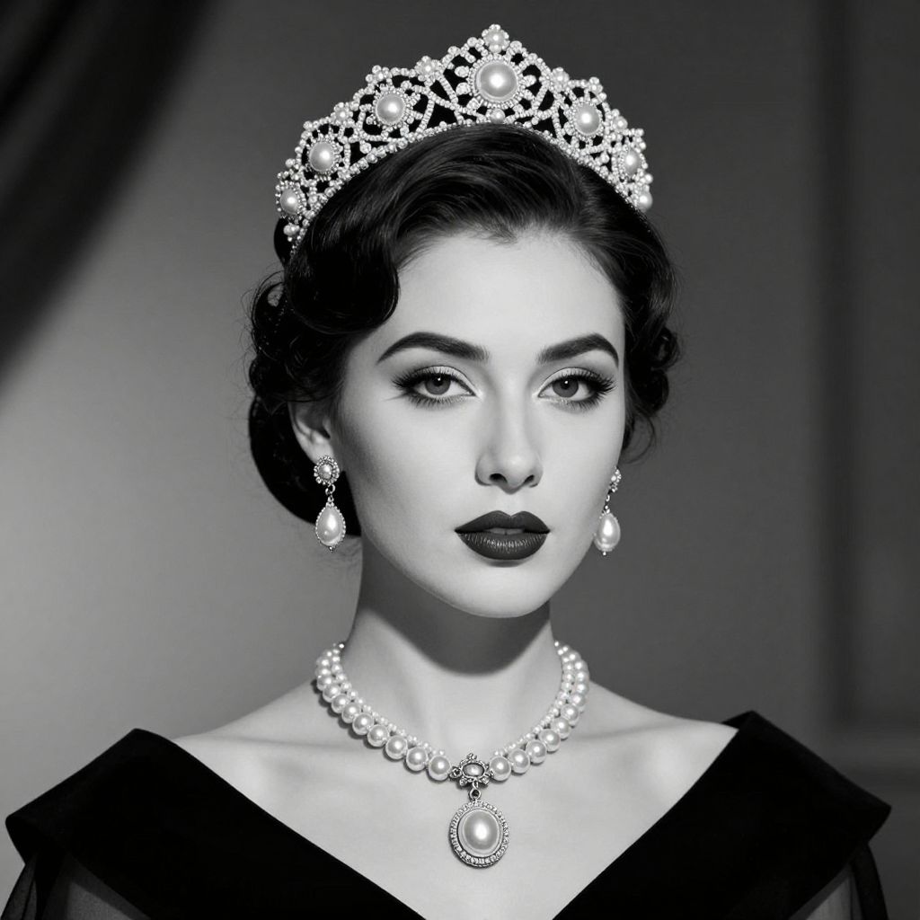 Black-and-white photograph of a woman with fair skin, dark wavy hair, and dark lipstick. She wears a delicate, ornate tiara, teardrop earrings, and a pearl necklace with a large central pendant. Her black, off-shoulder dress contrasts with her luminous complexion. The background is blurred, highlighting her regal, elegant appearance. The image has a classic, vintage style, reminiscent of 1950s fashion photography, with high contrast and sharp focus on her face and jewelry.