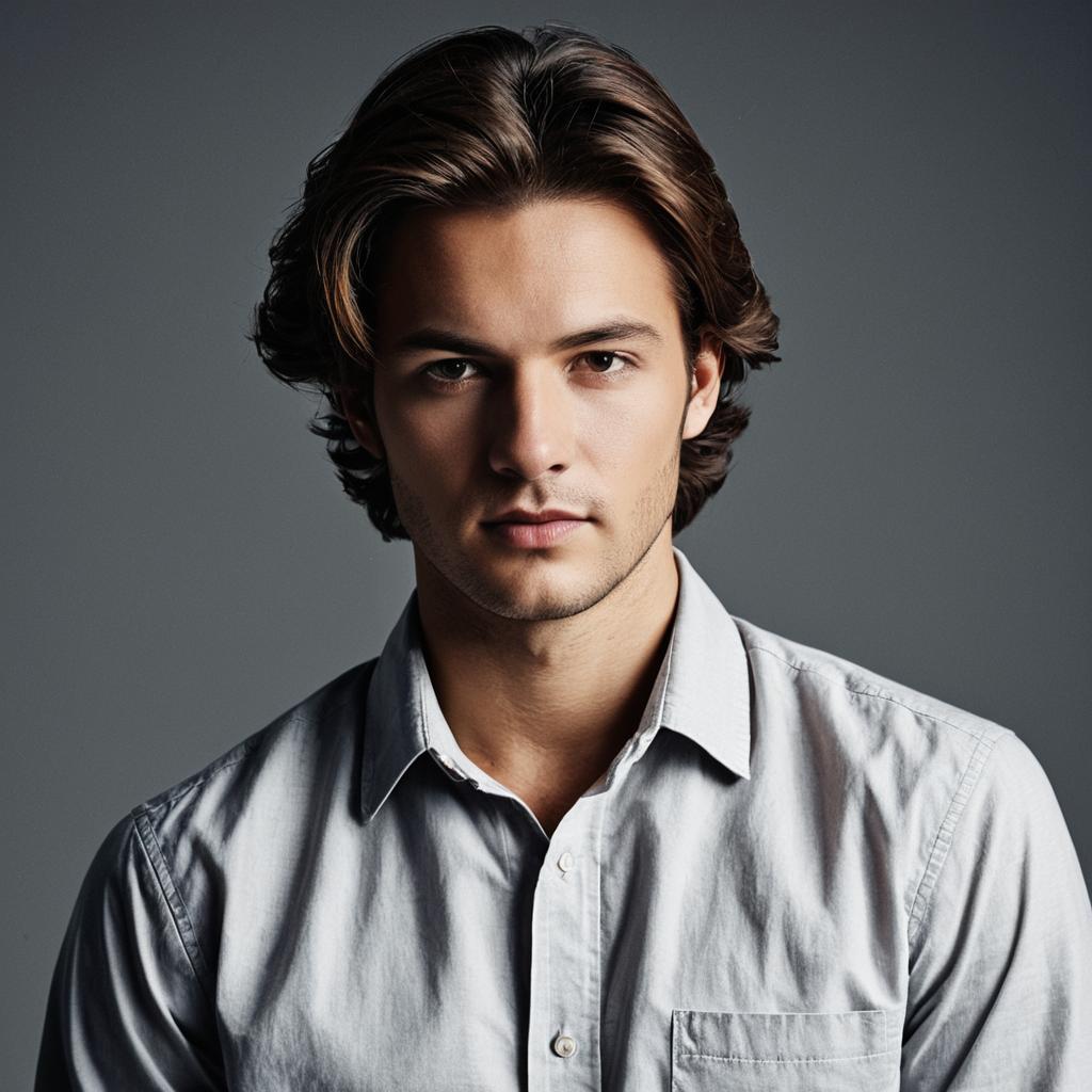 Man stylish shirts,1boy, male focus, solo, realistic, shirt, brown hair, looking at viewer, collared shirt, sleeves rolled up, manly, upper body, grey background, closed mouth, photorealistic, white shirt