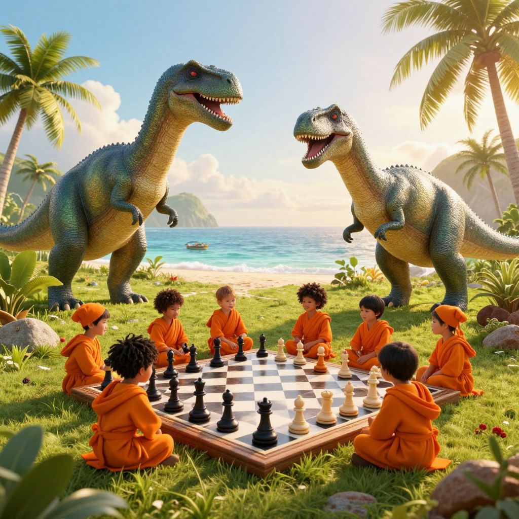 Children sit cross-legged around a wooden chessboard, engaged in a game as two towering T-Rex dinosaurs loom behind them, their sharp teeth bared and golden eyes fixed on the scene, all set against a lush tropical backdrop with palm trees and a serene lagoon in the distance.