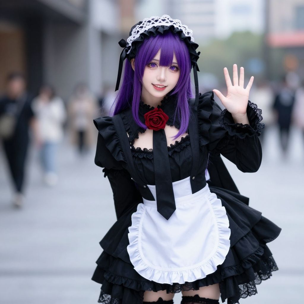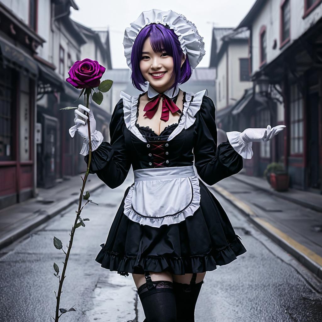 Digital art of a cute, smiling anime girl with purple hair, wearing a black and white maid outfit, holding a red rose on a sunlit street
