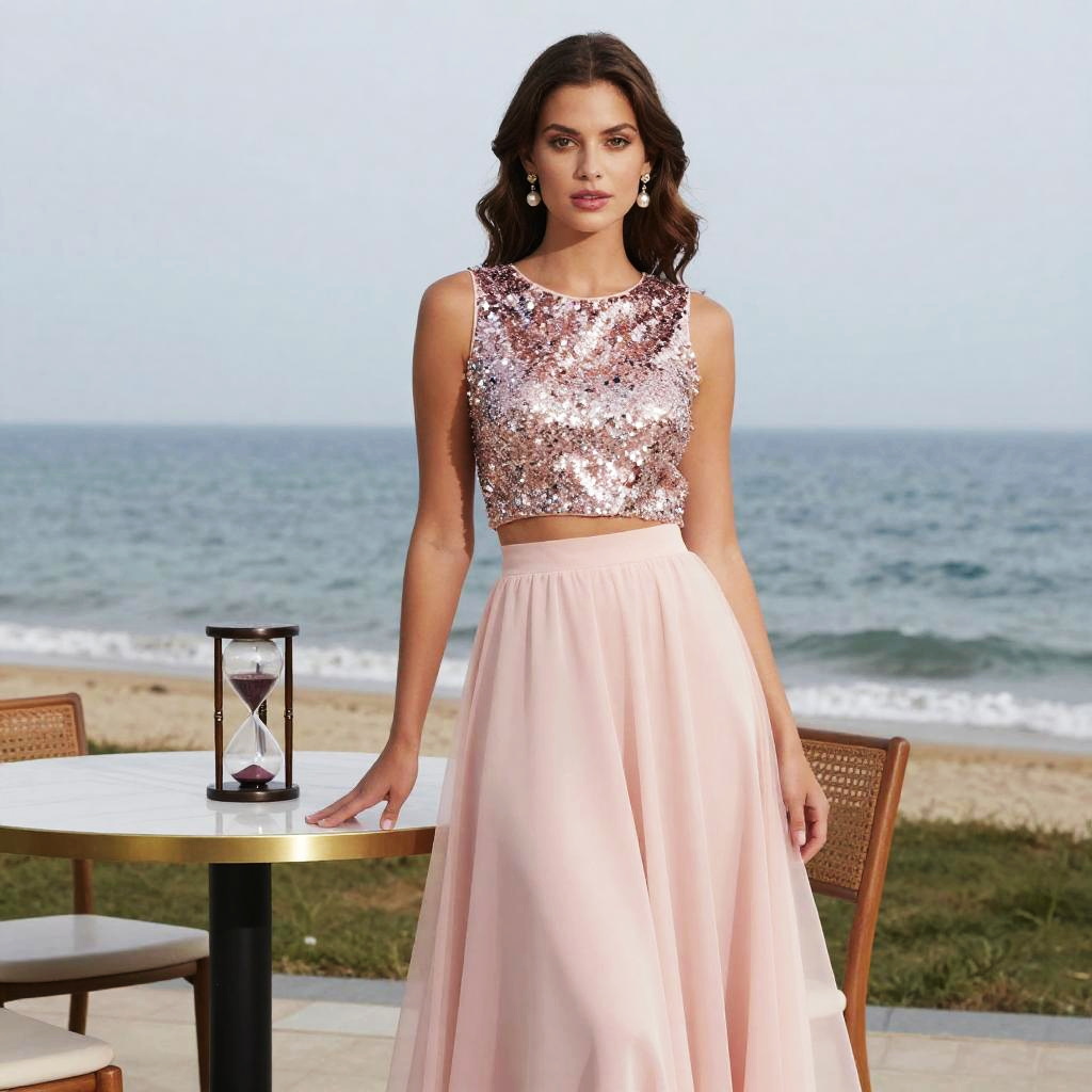 A hourglass woman in formal evening wear, featuring a sleeveless, sequined crop top in pink and silver and a flowing blush pink chiffon A-line skirt, stands elegantly at a seaside table with a coastal breeze. The visual style is reminiscent of studio bones, capturing the refined ambiance of the setting. Sexy. Pretty face and beutiful eyes