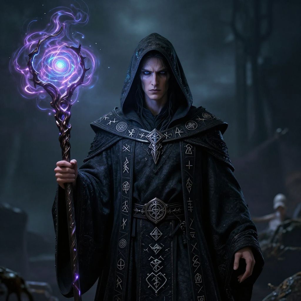Fantasy art DnD portrait of a mysterious sorcerer holding a staff with swirling magical energy, wearing dark robes embossed with arcane symbols, moody background