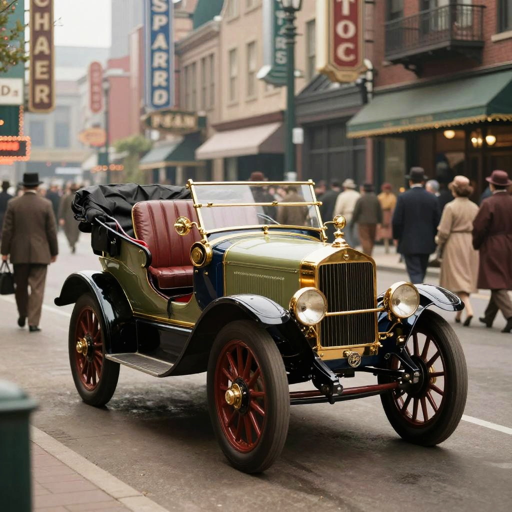 Classic Packard automobile displayed in a retro urban setting, 1920s city street with vintage signage, bustling crowd dressed in period clothing, soft focus background, elegant and nostalgic mood, rich textures and realistic reflections