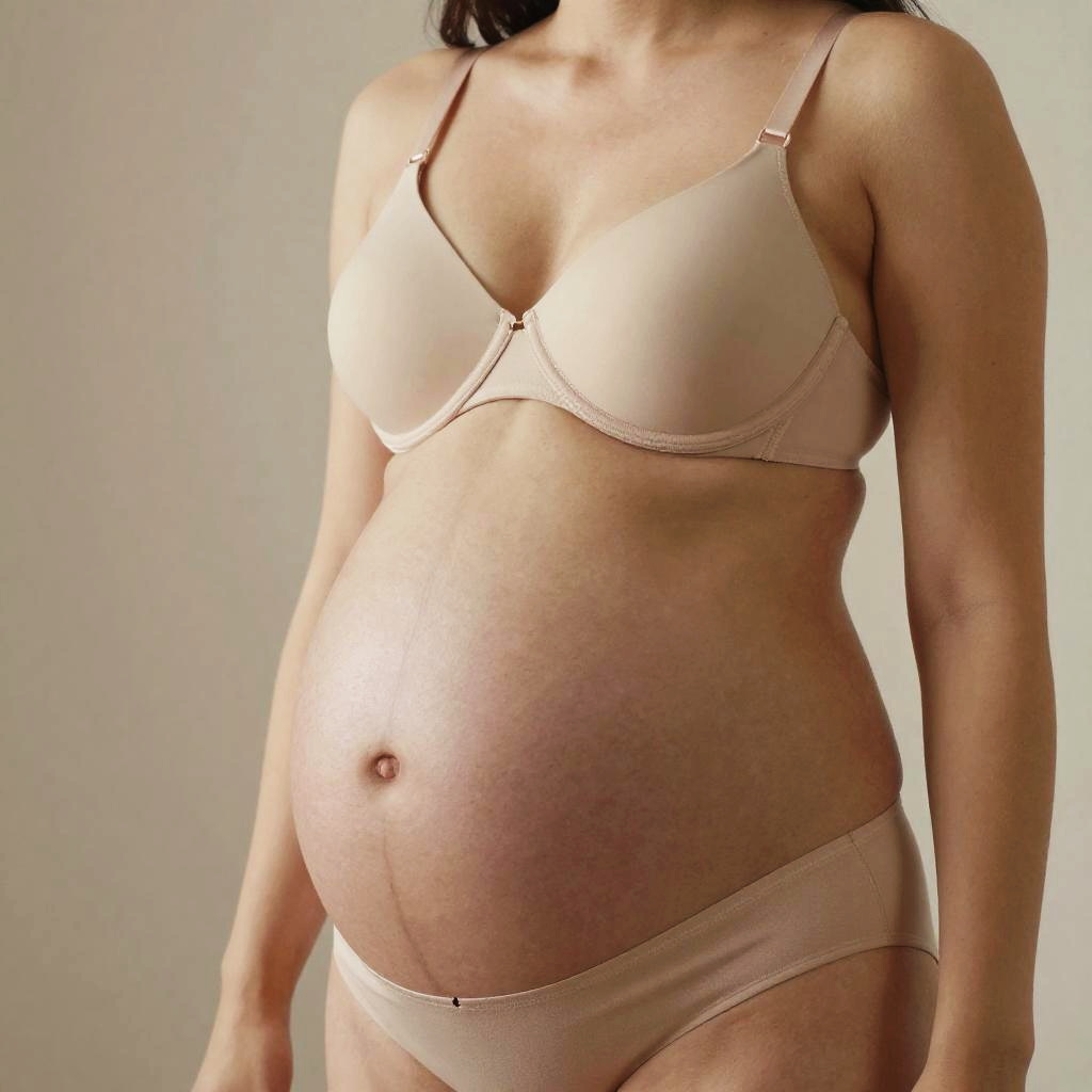 Photograph of a pregnant woman in beige bra and panties, standing against a plain white background, showing her round belly and natural skin tone.