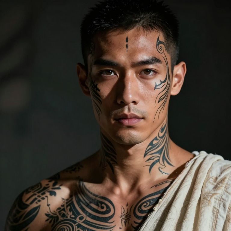 Craft a hyperrealistic digital portrait showcasing a charismatic figure adorned in modern fashion yet imbued with ancient mythological elements. The subject's striking features include intricate tribal tattoos that appear to animate and intertwine with their skin texture. Piercing eyes fixate on the viewer from an intriguing three-quarter perspective, while powerful lighting casts dramatic shadows across their chiseled jawline and high cheekbones, subtly revealing a mysterious scar on their forehead—a symbol of their past experiences. This captivating portrait seamlessly blends ancient mysticism and contemporary aesthetics, evoking a profound emotional response.