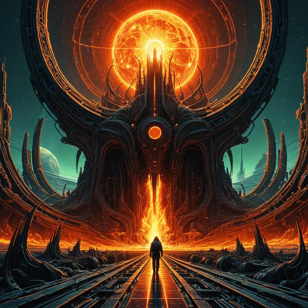 Hyperrealistic sci-fi scene depicting a robot rebellion during a neo-apocalyptic future. The image features a massive robotic creature with intricate mechanical details and glowing red eyes confronting two hooded humanoid figures walking along a rail track through a dark, ruined cityscape. The environment is depicted with volumetric and dramatic lighting, showcasing towering, ornate futuristic architecture inspired by artists Syd Mead, H.R. Giger, Moebius, and Zdzisław Beksiński. The composition emphasizes depth of field and photorealistic textures, capturing an intense moment of annihilation of humankind.
