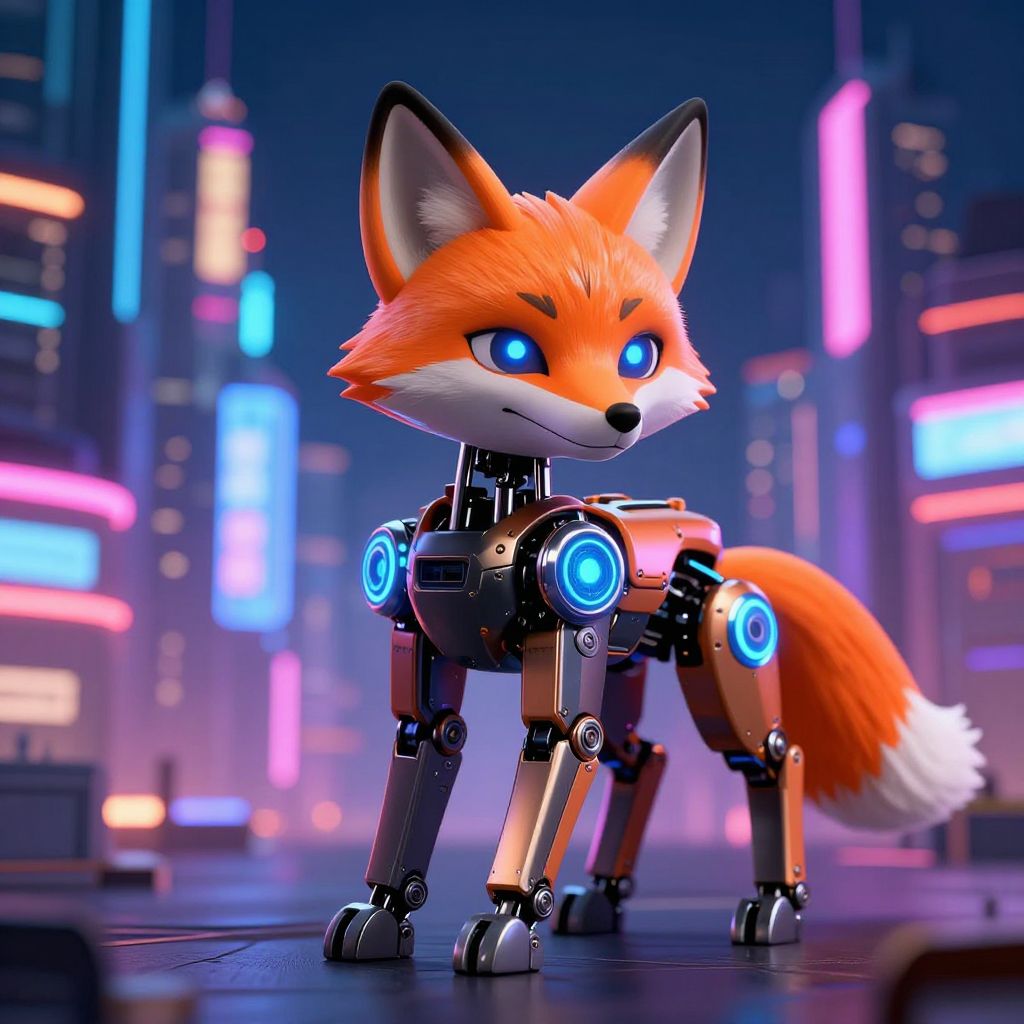 Detailed 3D rendering of a robotic fox with orange and black metallic components, illuminated with glowing blue circular elements. The fox is set against a vibrant futuristic cityscape filled with colorful neon signs and skyscrapers at night.
