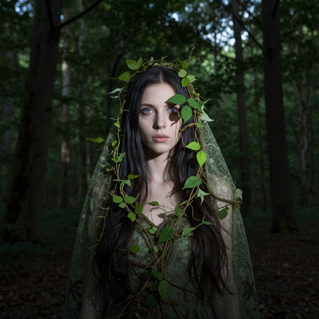Photograph of a pale-skinned woman with long, dark brown hair, standing in a dimly lit forest. She wears a translucent, green, lace-like veil adorned with small green leaves. Her intense blue eyes are illuminated by a soft light, creating a dramatic contrast against the dark, shadowy background of tall trees. Her expression is serene yet slightly mysterious. The forest is dense, with thick foliage and tall trunks, adding to the ethereal, almost fairy-tale-like atmosphere. The overall color palette is dark green and brown, with the woman's pale skin and blue eyes providing a striking focal point.