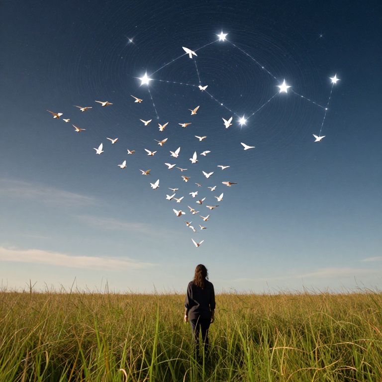 Photograph of a person with long dark hair, dressed in a black outfit, standing in a tall, golden grass field under a deep blue sky. They face away from the camera, gazing at a constellation of bright white stars and a flock of white birds, which seem to be flying upwards from the ground towards the stars, forming a magical connection. The stars are connected by thin lines, resembling a constellation pattern. The sky transitions from dark blue at the top to lighter blue near the horizon. The image conveys a sense of wonder and connection between nature and the cosmos.