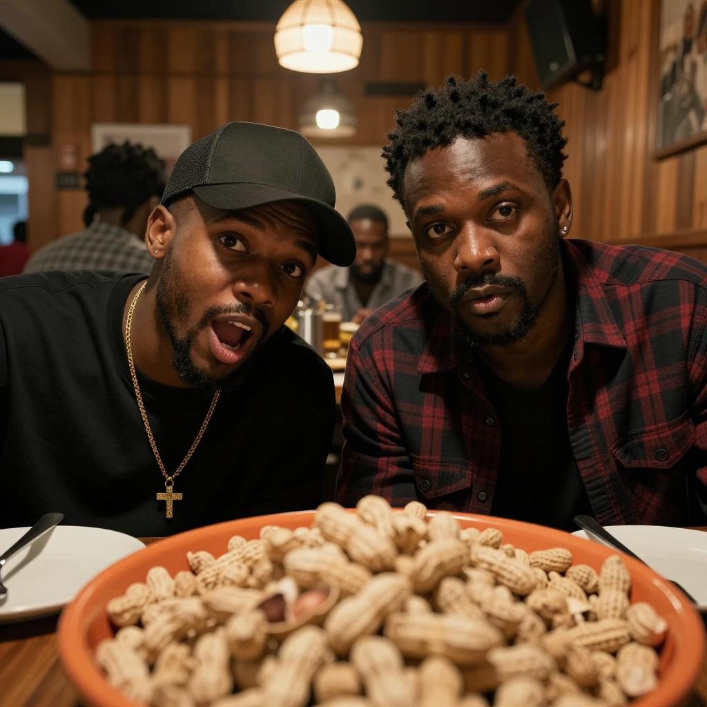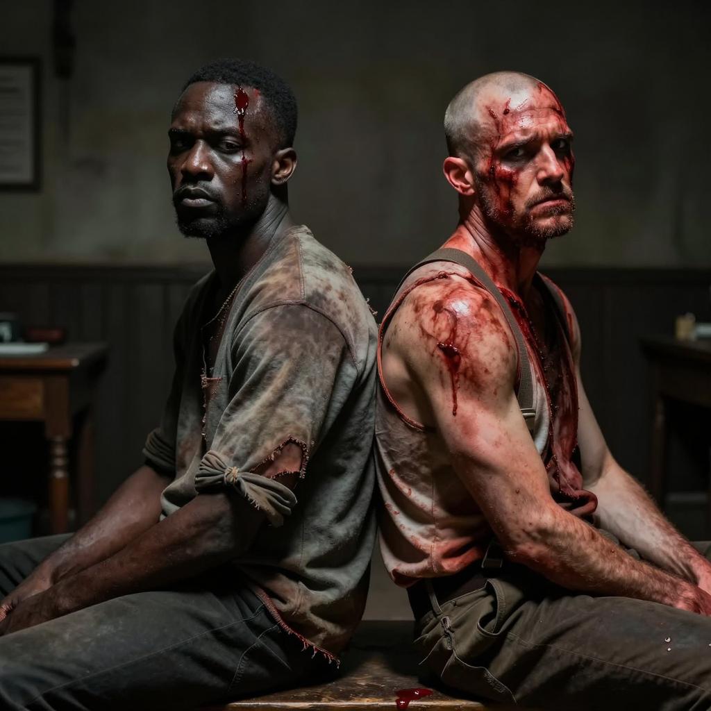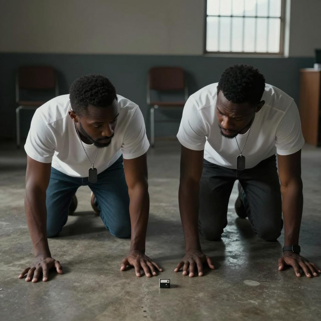 Two Black men on all fours on a concrete floor in a dimly lit room. Both wear white t-shirts and dog tags, looking intensely at a small object on the floor. Background includes empty chairs and a window with bars.