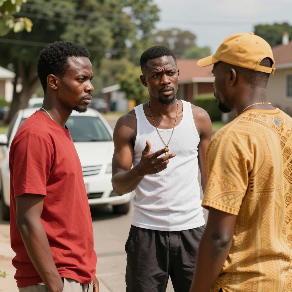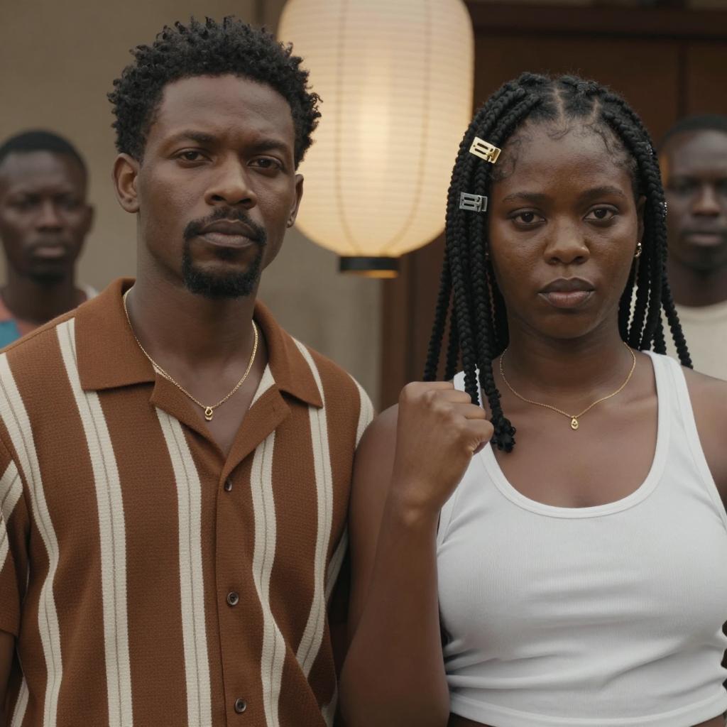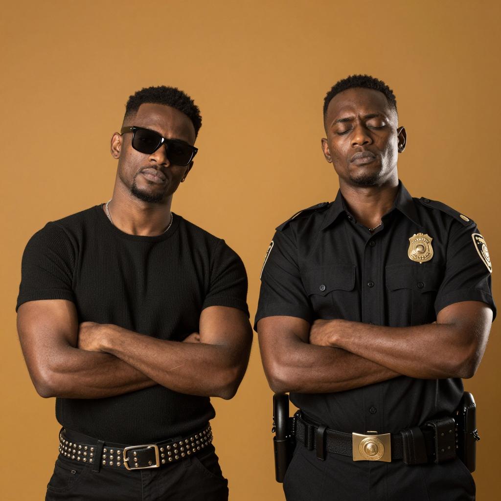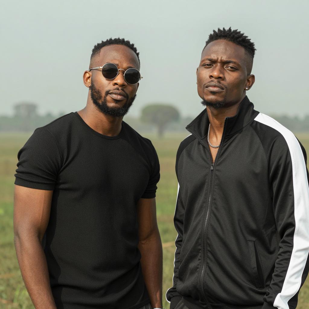 Two Black men on all fours on a concrete floor in a dimly lit room. Both wear white t-shirts and dog tags, looking intensely at a small object on the floor. Background includes empty chairs and a window with bars.
