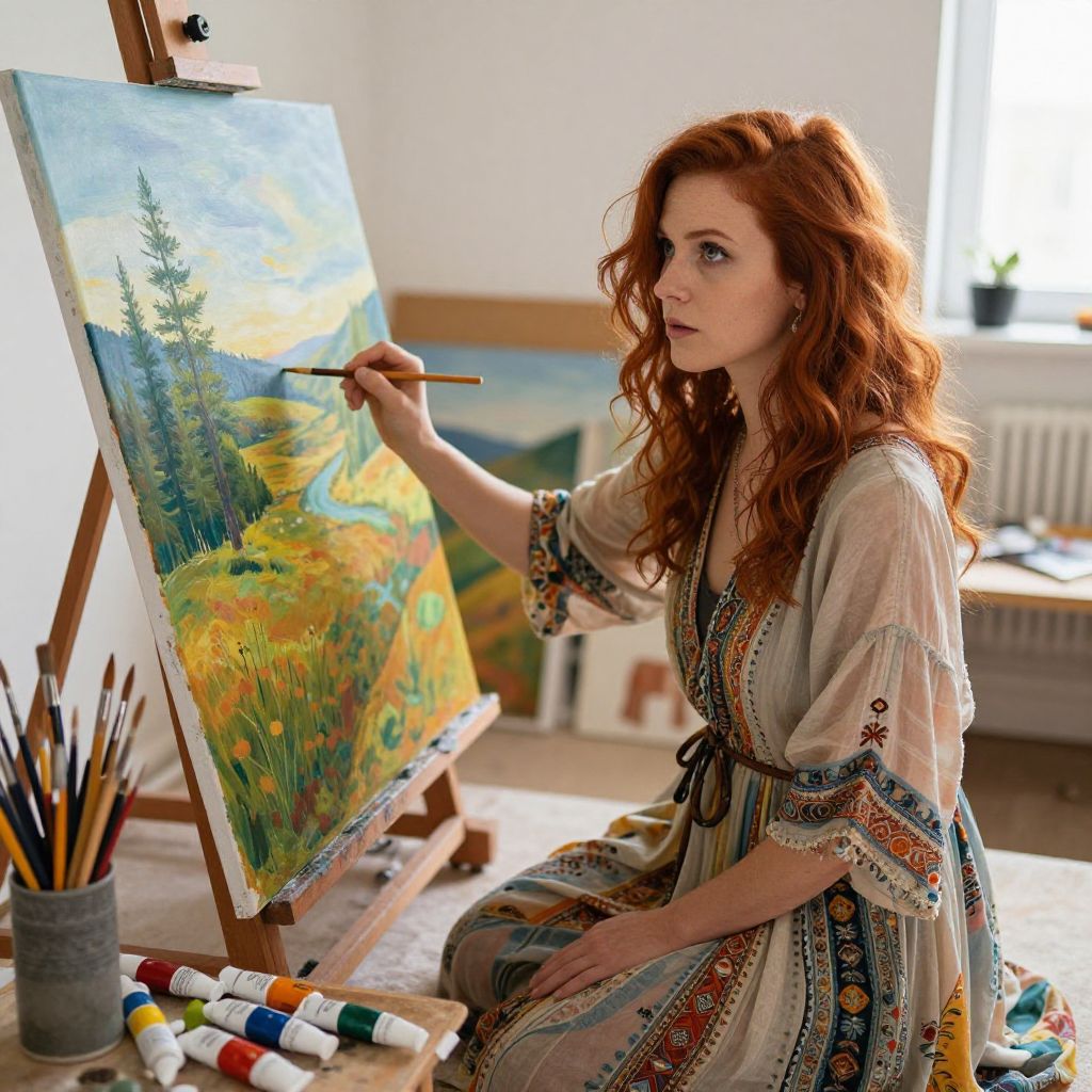 Red haired woman painting a vibrant landscape on a large canvas in a sunlit studio, surrounded by scattered brushes and colorful paint tubes, wearing a flowing bohemian dress, with intense focus and creativity in her eyes, soft natural light illuminating the scene.