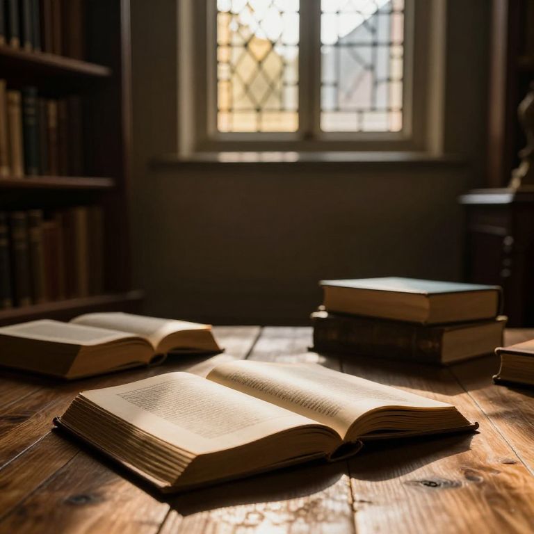 Photograph of a dimly lit library room with sunlight streaming through a stained glass window in the background. The wooden table in the foreground holds three open books with yellowed pages, casting soft shadows. Two stacks of closed books are also on the table, one in the upper right corner and another slightly to the left. The background features tall, dark bookshelves filled with books, creating a cozy, scholarly atmosphere. The sunlight highlights the textures of the wood and book pages, adding warmth to the scene.