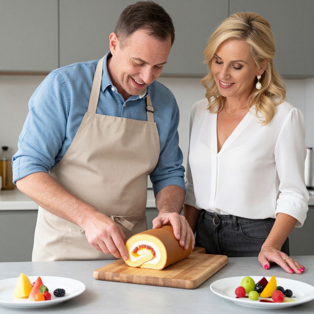 James Martin, wearing a blue shirt and beige apron, stands beside a blonde woman in a white blouse, demonstrating his Swiss roll recipe on a wooden cutting board that holds a rolled cake with vibrant layers, while a plate with fruit garnishes rests nearby.
