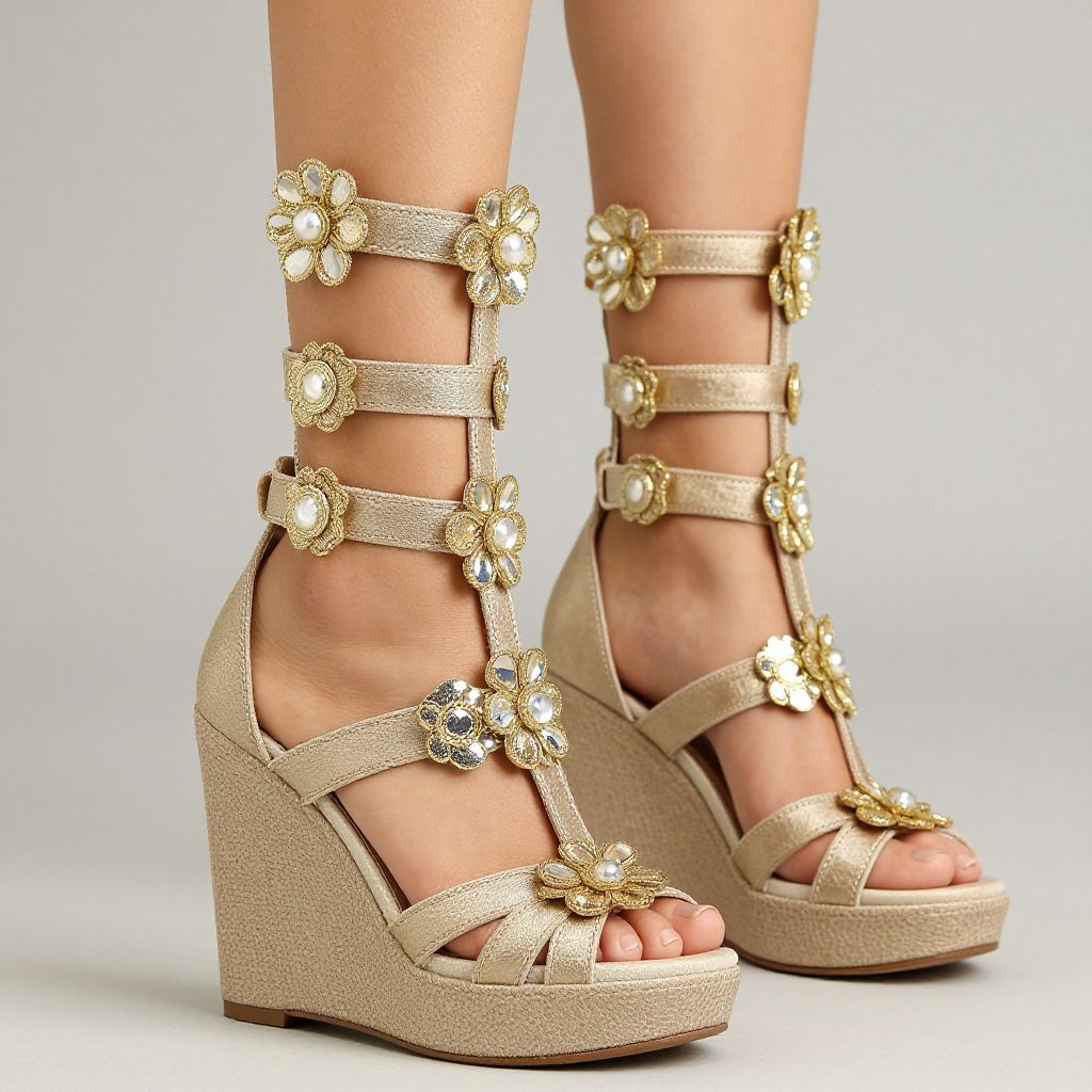 5a76aba1a4ec7 Luxury Woman Caged Heels Platform Wedge Sandal Flower Decorations Cutouts Gladiator Sandals Party Wedding Dress Shoes