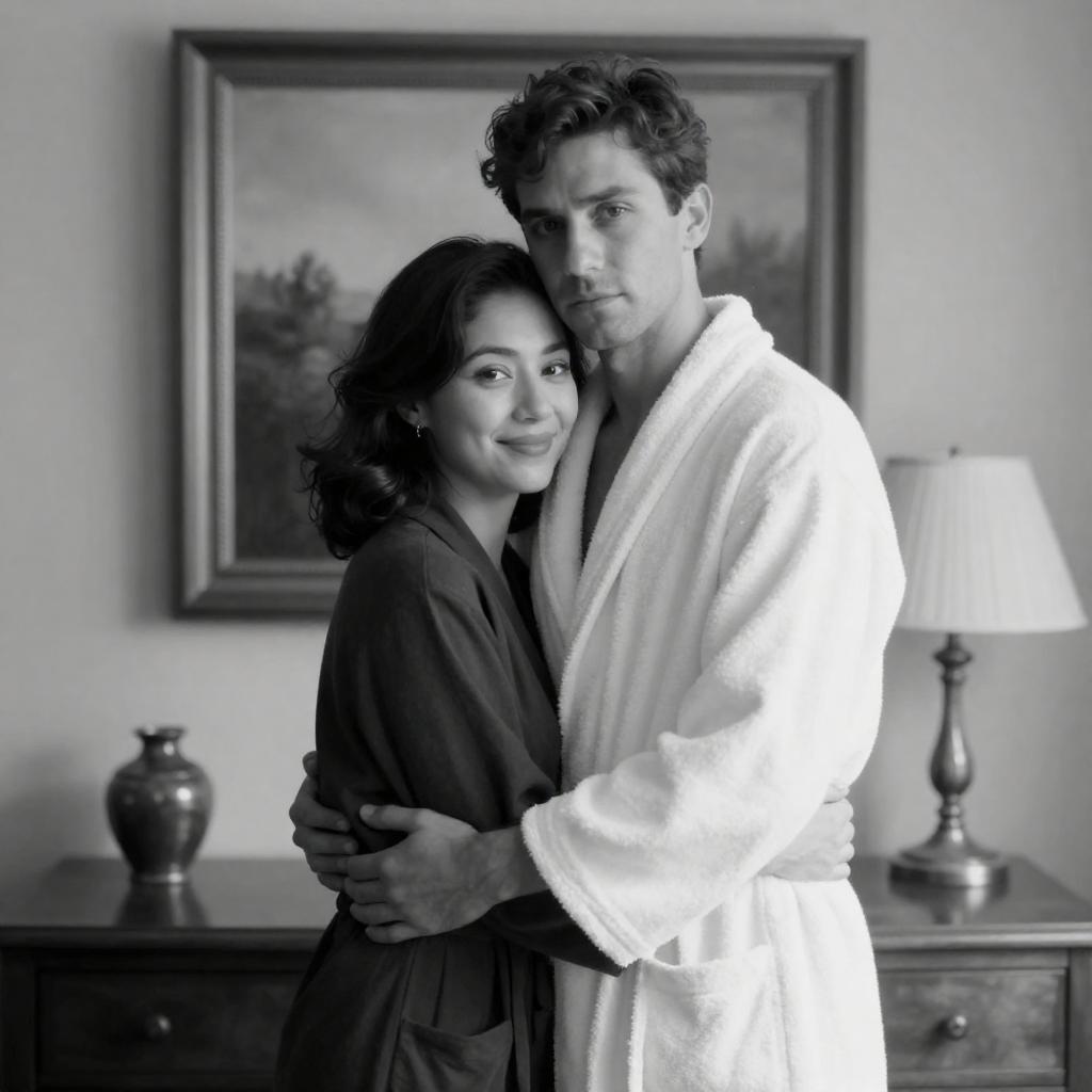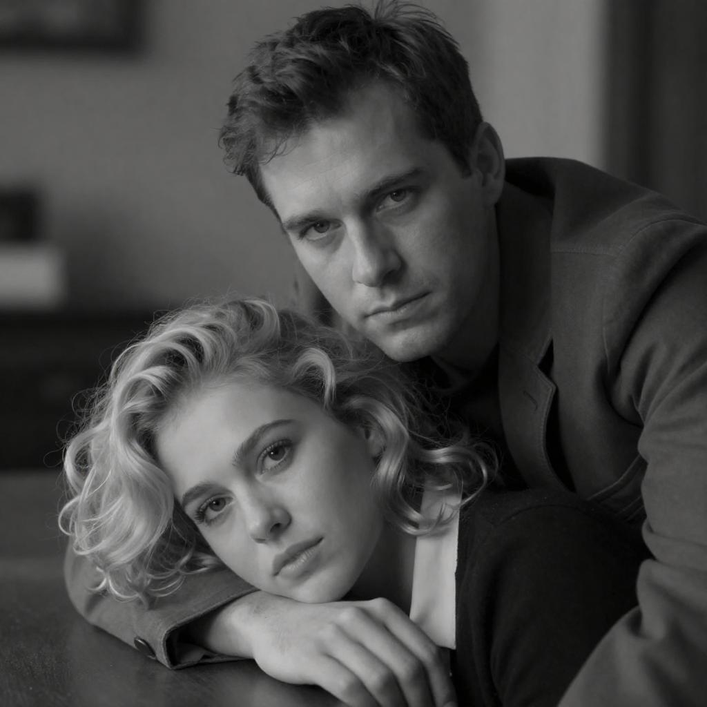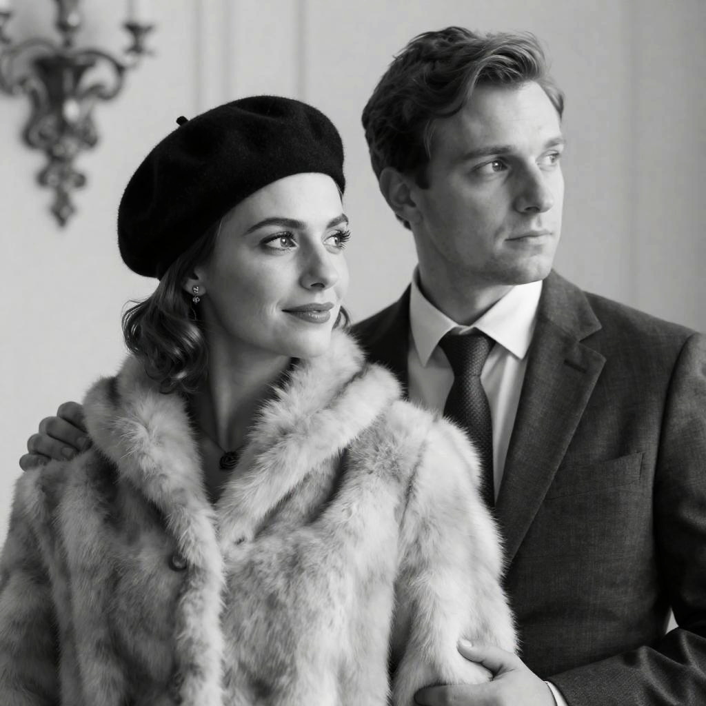 Black and white photograph of a smiling woman and a smiling man sitting closely together on a fur-covered bench. Woman wears a fluffy fur hat and coat, man in a fur-lined coat. Background shows snowy outdoor scene. Both have short dark hair. Woman on left, man on right.