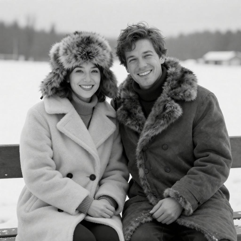 Black and white photograph of a smiling woman and man sitting closely together on a bench outdoors in a snowy setting. The woman on the left wears a fluffy fur hat and a light-colored fur coat, with short dark hair visible. The man on the right wears a dark fur-lined coat and has short dark hair. Both appear happy and dressed warmly for winter weather.