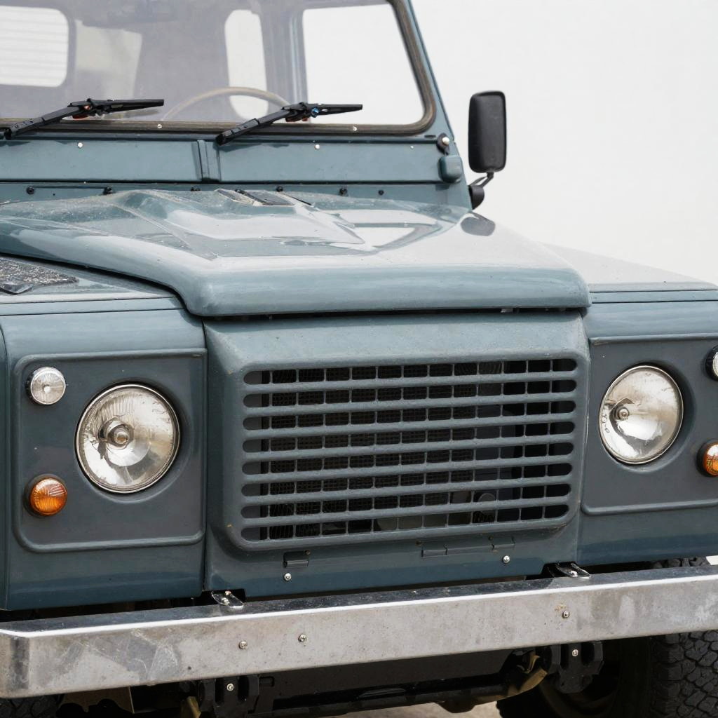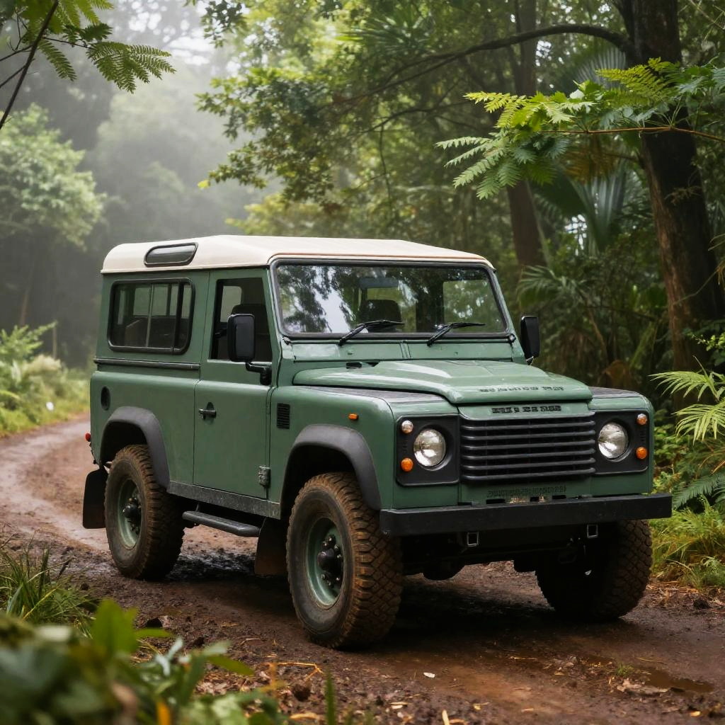 Land Rover Defender 1970 driving through muddy river crossing, splashing water, dynamic action shot, realistic textures, wilderness backdrop, strong and durable impression