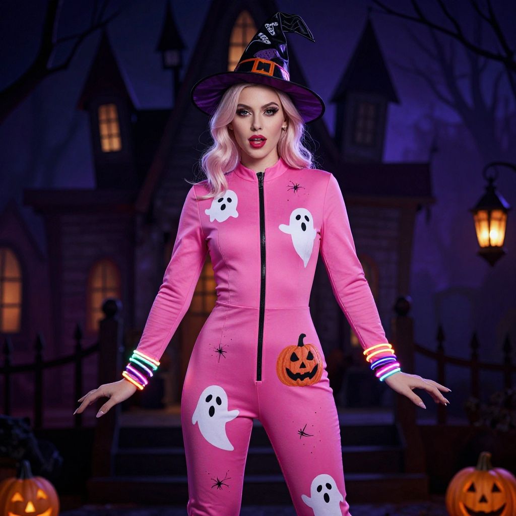 Photograph of a blonde woman with fair skin wearing a pink, full-body, zip-up Halloween costume adorned with white ghost and orange jack-o'-lantern prints. She sports a black witch hat with a buckle and multicolored wristbands. Her makeup is bold with red lipstick. The background features a dark, Gothic-style house with lit windows and leafless trees. Two carved pumpkins are visible at the bottom. The scene is illuminated with a blue and purple light, enhancing the spooky atmosphere.