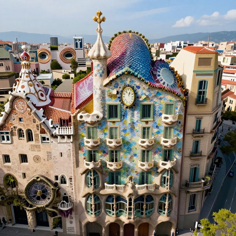 Craft an enchanting digital artwork that harmoniously marries the dynamic color palette and dreamlike distortions characteristic of surrealism with the intricate architectural flourishes synonymous with modernist design. The scene should showcase a bird's-eye perspective from an extraordinary creature as it traverses through a fantastical Barcelona, where emblematic landmarks like Park Güell and Casa Batlló are imbued with surrealistic aberrations. Capture the essence of melting clocks and levitating objects while integrating Gaudí's signature mosaic patterns and sinuous structures. This composition should exude an atmosphere of delight and eccentricity combined with a hint of chaos, enticing viewers to embark on an exploration of the fantastical confluence of reality and imagination within this surreal modernist metropolis.