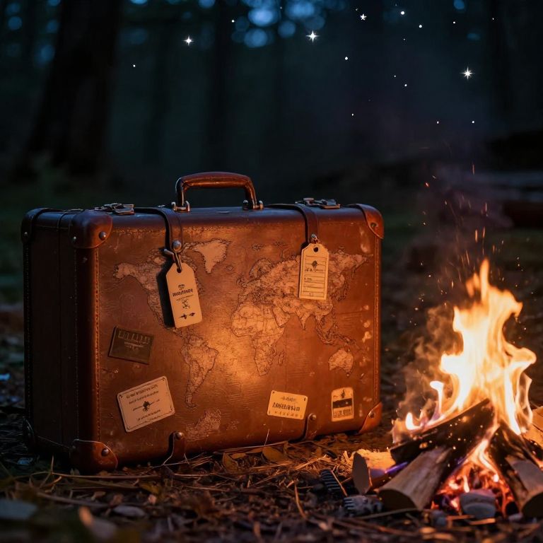 A rustic old suitcase covered with travel tags from around the world, sitting beside a cozy campfire in a forest clearing at night, stars twinkling overhead, soft warm lighting, highly textured and nostalgic mood
